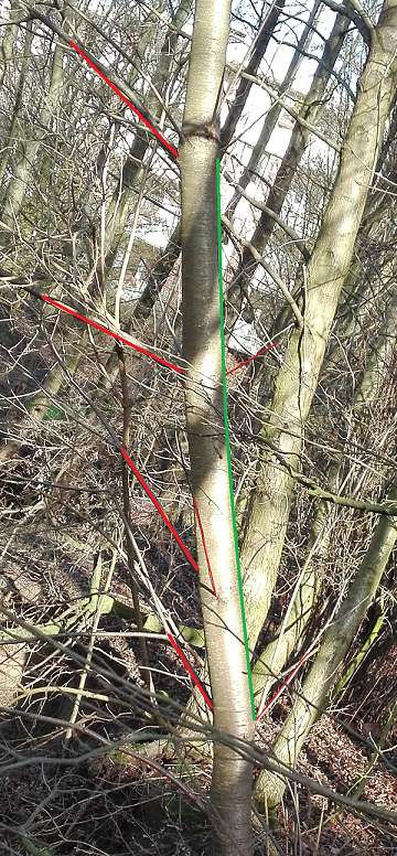 So schräg, wie der Stamm aus dem Boden kommt, kann durchaus mit Drehwuchs gerechnet werden.......
