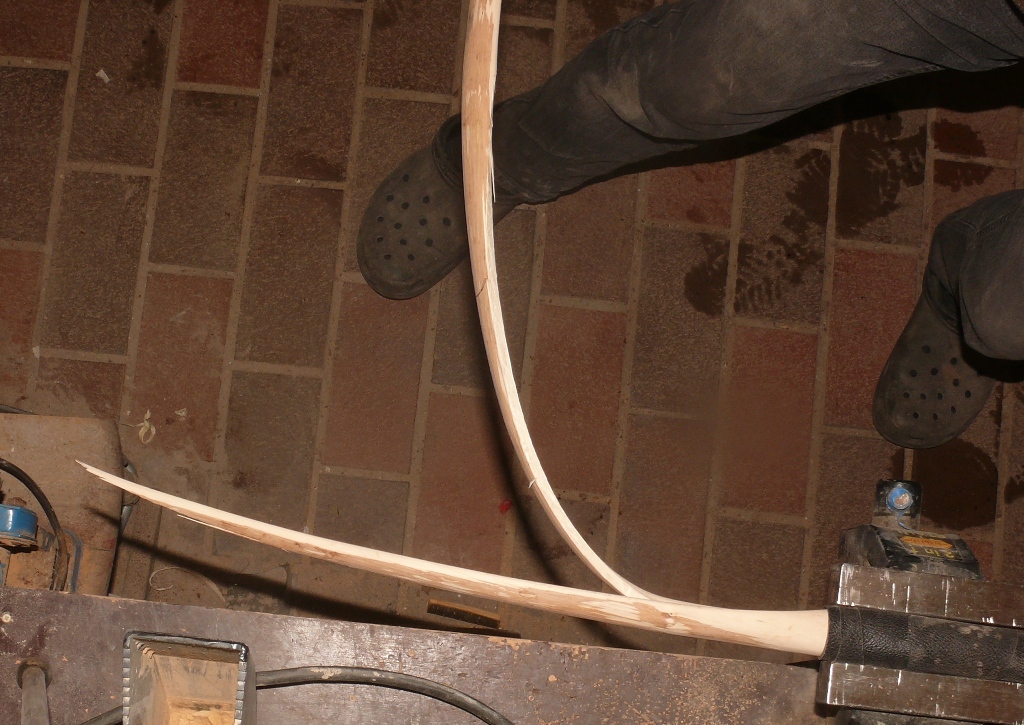 der erste Kandidat ist der Pfaffenhütchen - Bogen, der mir beim SapTurnier 2015 geplatzt ist - bzw. der übriggebliebene 2. Wurfarm davon: dann hab ich noch einen Versuch mit Hasel gestartet, der mir ebenfalls um die Ohren geflogen ist. Hier der (bis dahin überlebende) 2. Wurfarm:Die mögliche Biegung ist schon beachtlich...