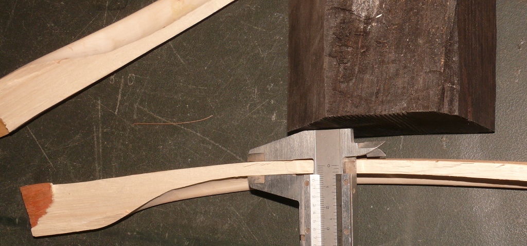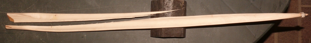 dann hab ich noch einen Versuch mit Hasel gestartet, der mir ebenfalls um die Ohren geflogen ist. Hier der (bis dahin überlebende) 2. Wurfarm:
