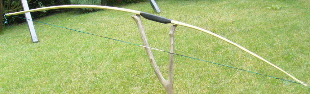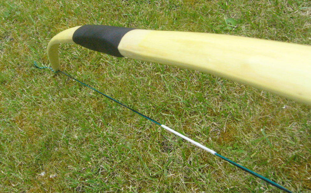 Bogen hat 43# @28", Sehne 12 Strang Dacron, Finish mit 2 Lagen Leinölfirnis, Nockoverlays aus dünnem Rehgeweih.