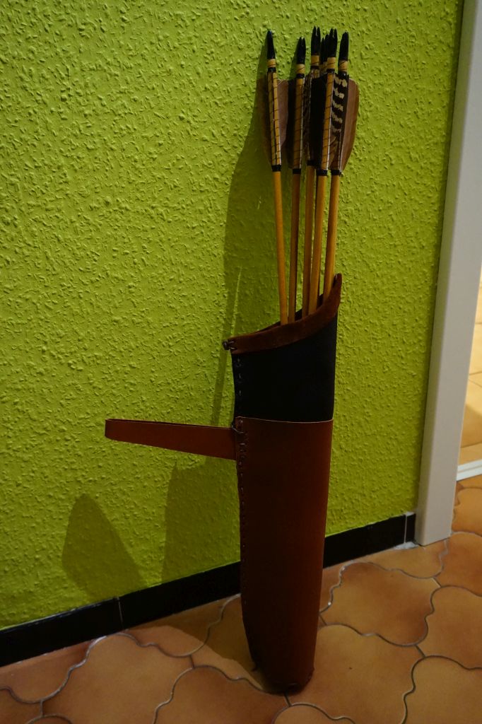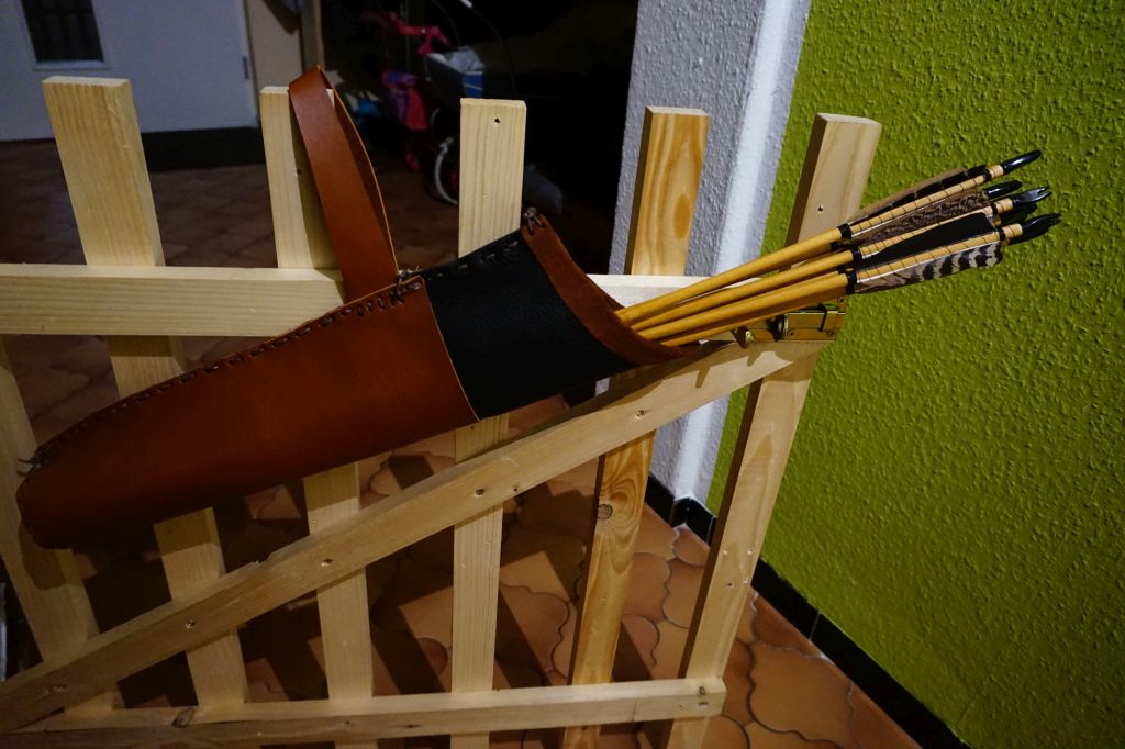 ich habe mir Lederreste besorgt und da war genau ein passendes Stück dickes festes Leder, was nicht als Griffleder eignet dabei. Mir blieb garnichts anderes übrig, als einen Köcher zu bauen