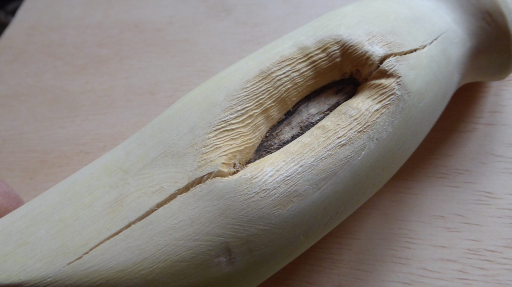 Entrindet/ bis zum Markkanal runtergeschnitzt / Griffstück stehen lassen / Holz leicht Reflex aufgespannt und halbes Jahr trocknen lassen