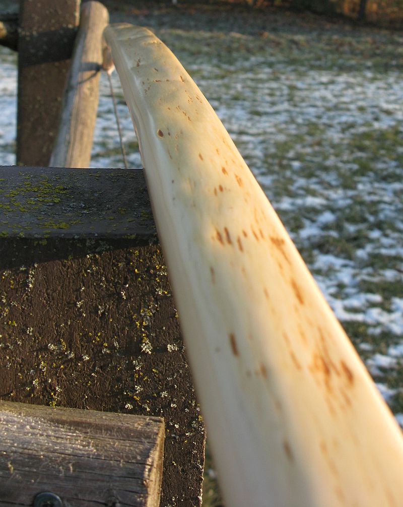 Etwas deflex auf dem oberen WA, aber insgesamt hat das Holz null Fehlerstellen. Ich habe es mir aus Billigkeitsgründen erspart Splint abzuarbeiten, daher ist der Rücken direkt unter der Rinde.