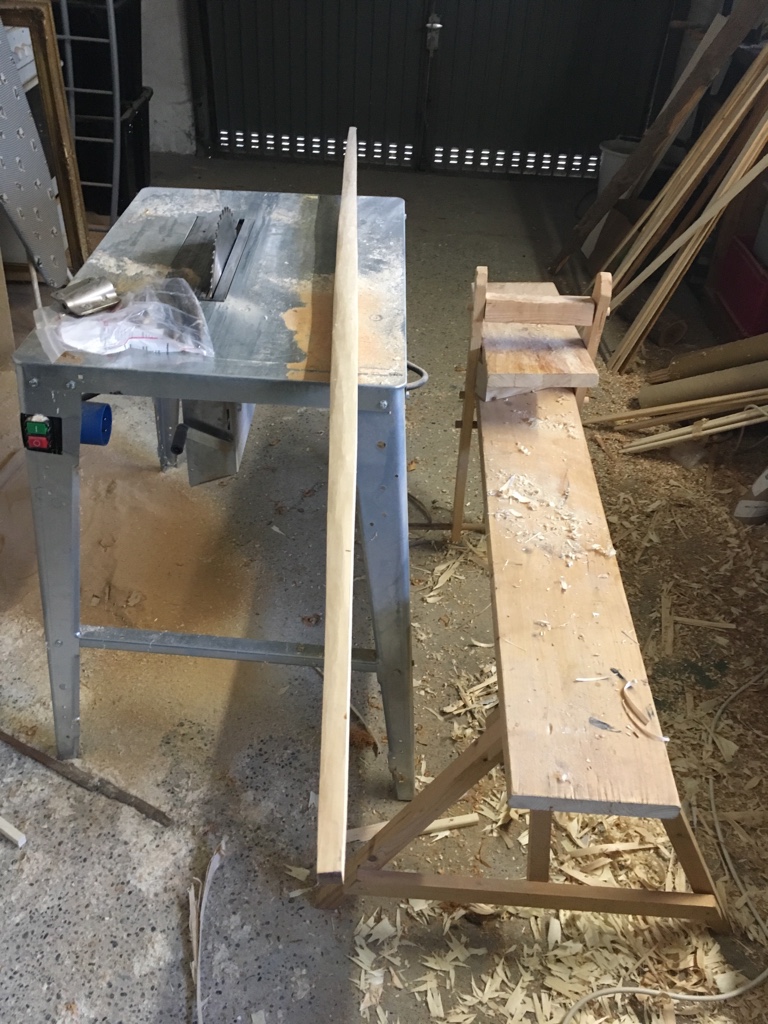 Der erste Dickentaper war dann 3mm auf 20cm von der Mitte bis zu den Nocken. Die Ecken gerundet, lange Sehne drauf und ab auf den Tiller: 130 # @ 24".