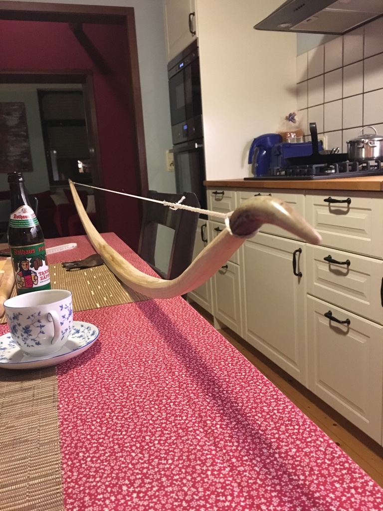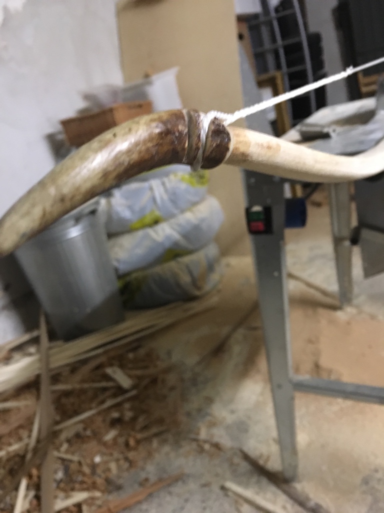 Tom hat hinterher dann auch gemeint, dass Ulme oft Spannungen drinhat, die dann frei werden, wenn man den Bogen in der Breite rausarbeitet. Ich hab da leider nicht drauf aufgepasst, auch weil der erste so schoen gerade geblieben war. Wie ich's dann gemerkt hab, war's zu spaet um noch was zu machen, ausser ihn auf gut 1.8m abzusaegen. Da wird fuer meine Affenarme kein Warbow mehr draus.