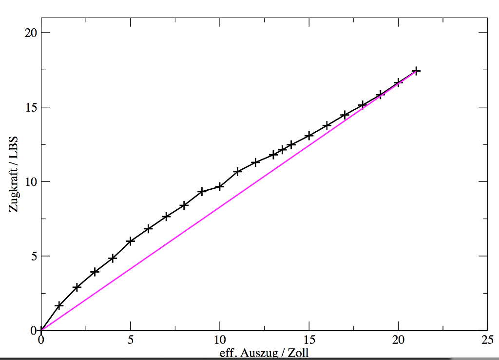 Ich hab eine ziemlich grobe Federwaage und nur einmal je Zoll gemessen (einmal auch bei einem halben Zoll bei 13.5) daher das "Rauschen". Ich hab mir grad eine (hoffentlich) bessere Kofferwaage bestellt und würde für bessere Kurven auch 3-5 mal messen und mitteln (oder ähnliches). Aber der Trend kommt glaub ich ganz gut raus.