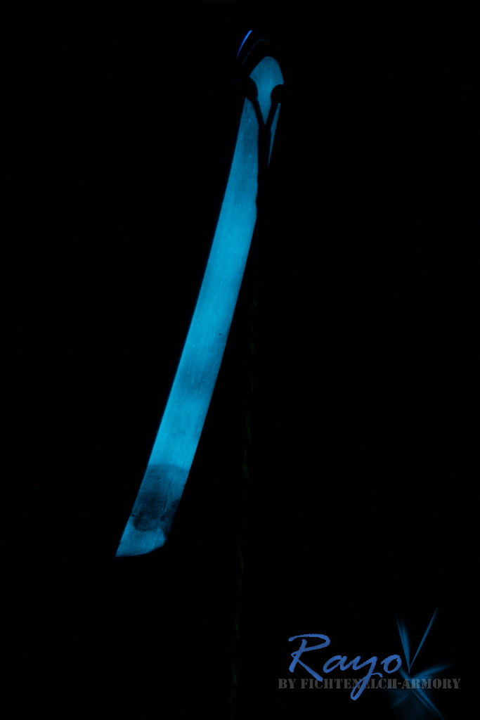 Ich habe in den Kleber phoshorisierende Pigmente mit eingemischt und so strahlt das tagsüber sichtbare Padouk-furnier nachts im fetten Blau, die Tips fangen an zu leuchten, die Pfeilauflage strahlt und am Bogenbauch gibts auch noch ein Paar "Highlights".