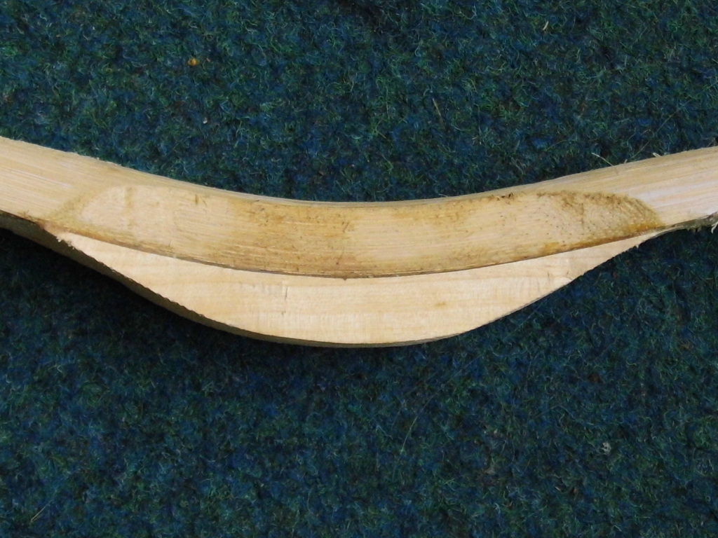 Zu sehen ist der Griff von der Seite. Der Bogenbauch ist oben, der Rücken unten, und ja, das sind knapp 30° Biegung.