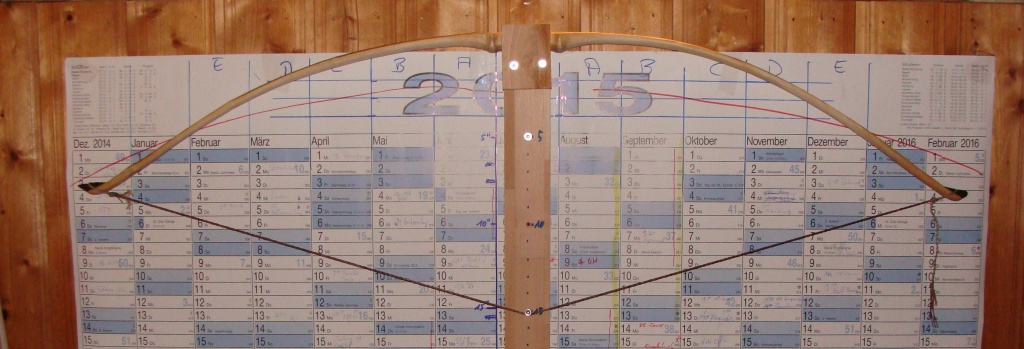 ich benötige beim folgenden Bogen etwas Hilfe beim Tillern. Ich war zuerst recht zufrieden und hab damit schon ein paar Probeschüsse mit ca. 22" Auszug gemacht und ihn einmal abgeschliffen und mit Leinöl eingeschmiert. Nun hab ich ihn wieder aufgespannt, ein paar Fotos gemacht und festgestellt, dass der auf dem Bild rechte Wurfarm noch eine Schwachstelle hat. Da mir der Bogen abgesehen davon recht gut gefällt und die Werte halbwegs ins Ziel passen, bin ich mir nicht sicher an welcher Stelle ich jetzt was wegnehmen soll, ohne ihn dabei zu verhunzen.