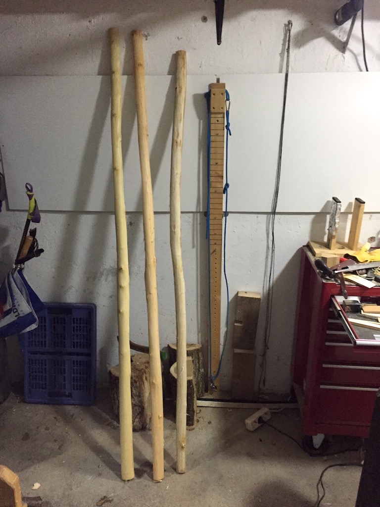 Bei Ahorn und Eberesche hab ich die grobe Form etwas verfeinert und beide auf 176 cm gekürzt. Beide gewogen und vom Keller ins Arbeitszimmer umgezogen.