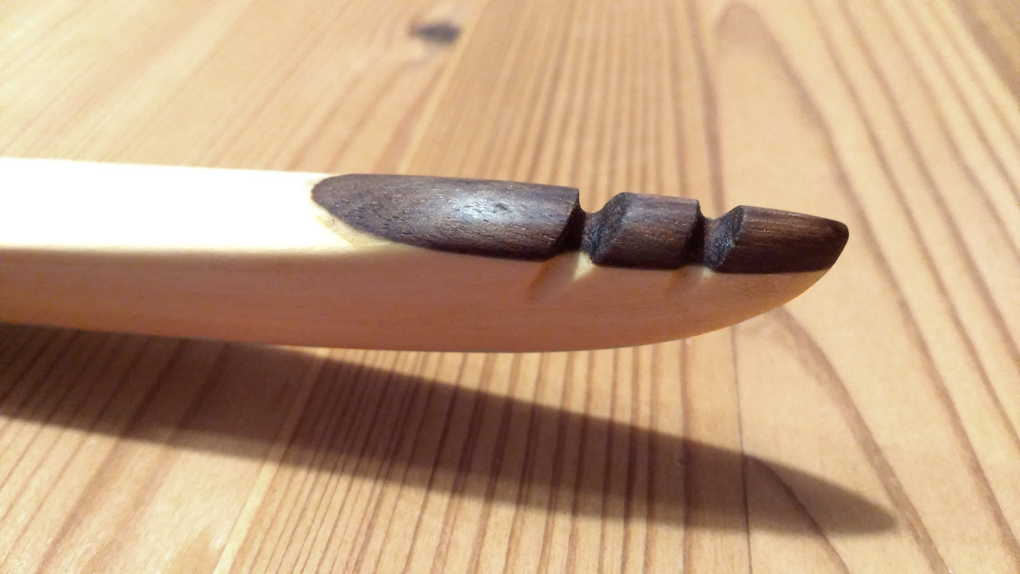 nochmal der Griffbereich mit Wicklung aus selbst geschnittenem Bergulme- und Schwarznussfurnier