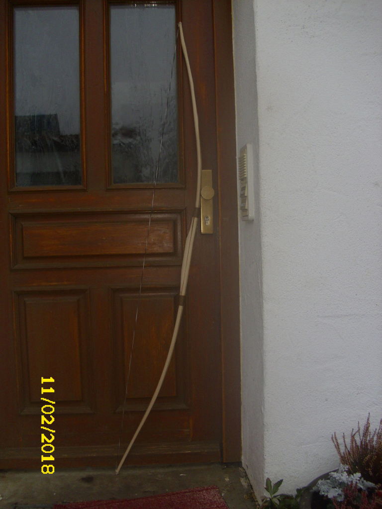 Fotos vom ungespannten Bogen , auf Standhöhe , Vorderansicht und Vollauszug sowie die Nennung der üblichen Daten zum Bogen sprich Auszug , Zuggewicht , Länge, Holzart etc