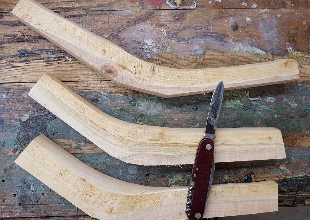 Naja, das Holz muss trocknen - das dürfte beim Hasel 3 Wochen dauern, vielleicht auch etwas kürzer, der Holunder iss raus und die Hainbuche dürfte noch etwas länger brauchen - insofern fällt Sehne aufm Rücken aus. Aber die 2-Holz-Bogen brauchen keine Sehne, Hasel ist stark genug und sollte auch Hainbuche aushalten. Muss ja auch kein Monsterbogen werden :D ;)