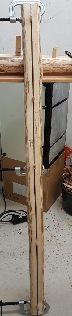 Dann alle Enden mit Holzleim eingeschmiert die Halbstämme wieder zusammen gezwungen und in einen kalten Raum gebracht und nun warten: