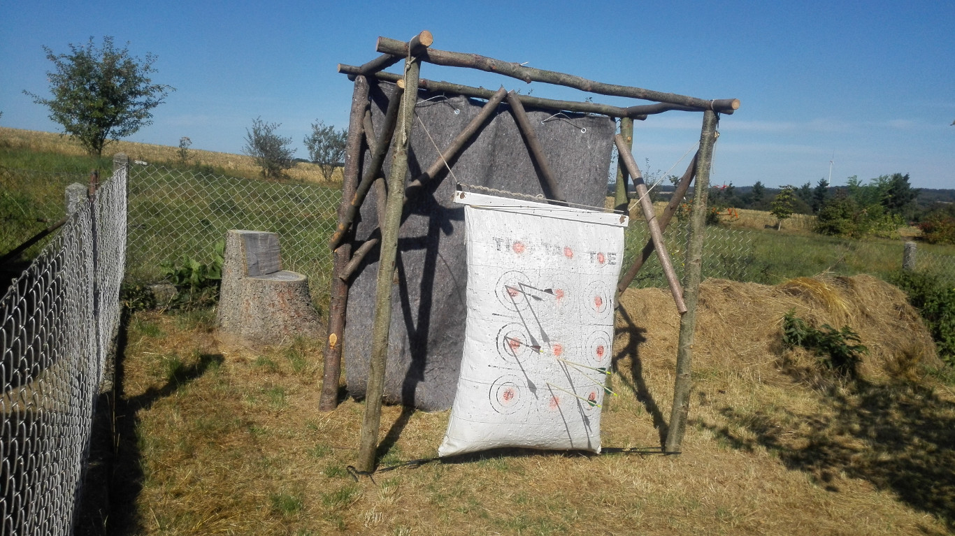 Seit einem Jahr hängt mein Schießsack (Gewebesack, 1x1,25m, Plastikfolienfüllung) vor dem Kirschbaum. Aber da soll er nun weg. In eine Ecke des Gartens in der ich eine Halterung dafür, samt dahinter hängendem Pfeilnetz bauen möchte. Irgendwann Richtung Herbst soll dann vielleicht noch eine kleine, offene Überdachtung in 12-15m Abstand davor. Dann kann ich auch bei schlechtem Wetter Stöckchen werfen gehen...