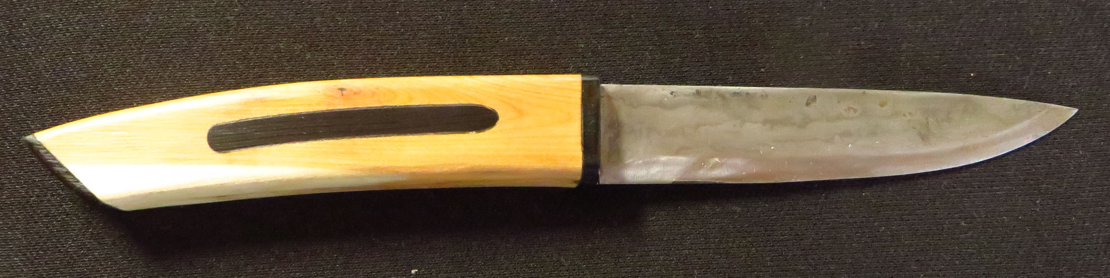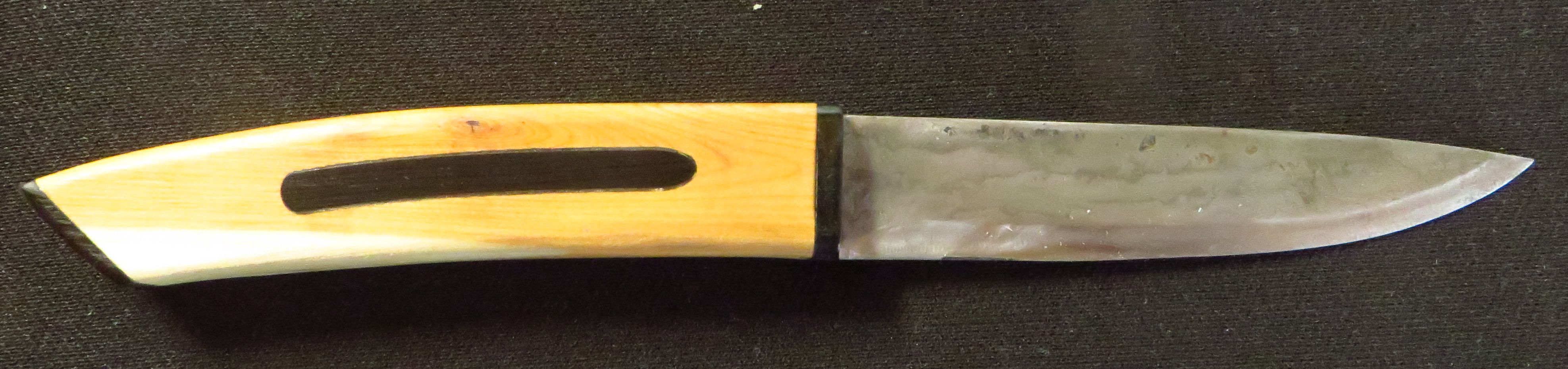 auf einem Messerschmiedekurs habe ich diese 5-Lagen Damast Klinge geschmiedet. Der Rohling war von Dictum aus weißem und blauem Papierstahl. Dazu habe ich dann einen Griff aus stabilisierter Eibe gemacht mit schwarzen Horn Einlagen.
