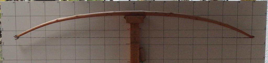 Ich habe vor allem die inneren Hälften oder Drittel der Wurfarme versucht auf gleichmäßige Biegung zu bringen. Er biegt gerade rechts im Griff etwas, so dass er nicht ganz grade aufliegt, weswegen der linke Wurfarm etwas schwächer erscheint, als er ist. Generell ist der Tiller eher Ellipse im Moment, von A bis E biegt er weniger als danach. Vielleicht sollte ich dort jeweils mehr Biegung reinbringen, damit es eher Richtung Kreistiller geht...?