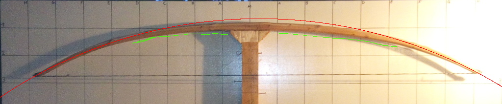 Links gefällt's mir besser, wenn auch noch mehr Biegung außen als innen. Rechts muss ich noch was tun, A-E leicht. Jetzt erstmal mehrtägige Bogenbaupause