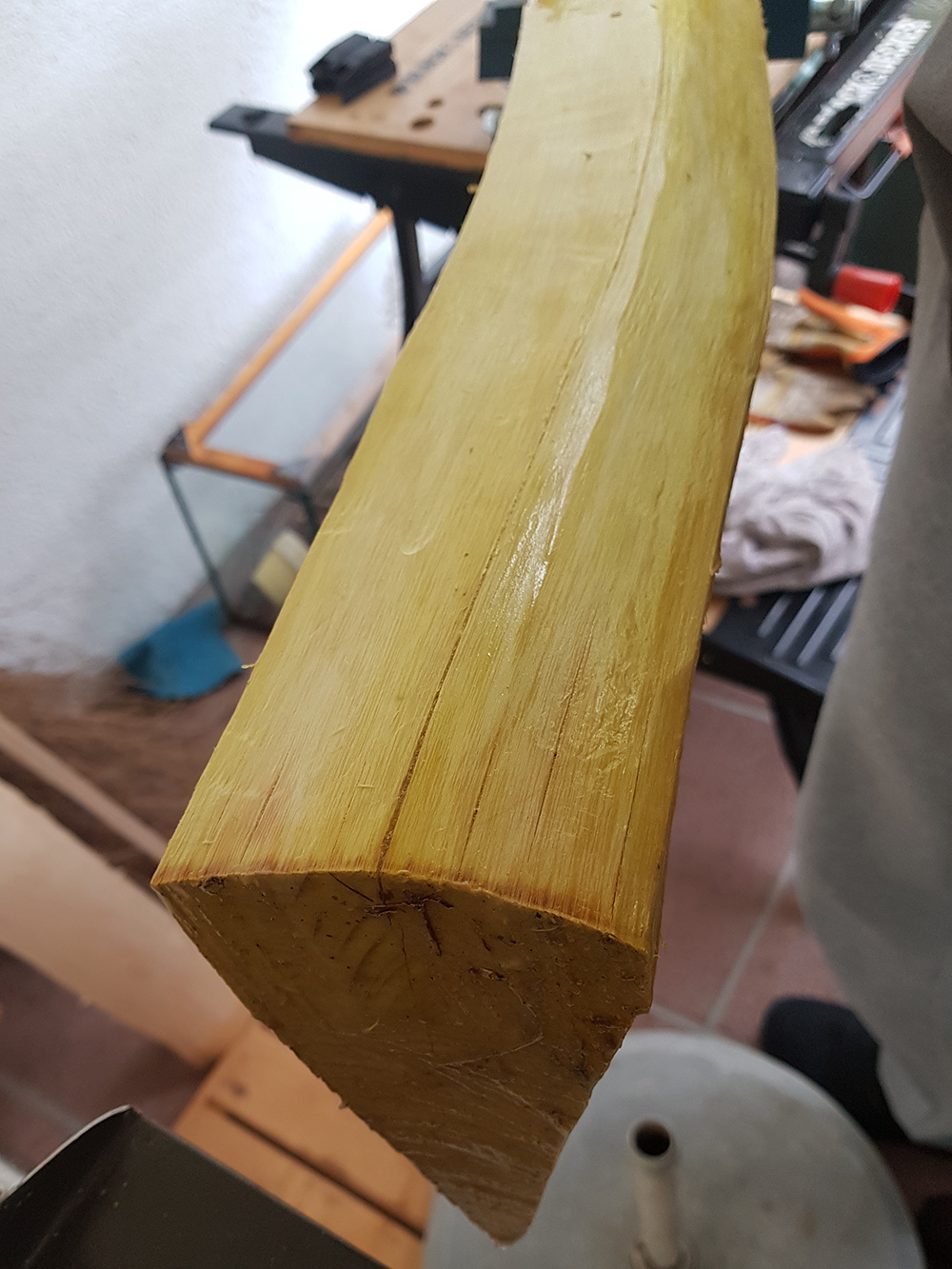 Mein 6.Bogen soll ein Osage-Recurve werden. Das Holz wurde im März 2019 in Ungarn geschlagen - im Oktober 2019 hab ich Rinde und Splint entfernt. Und da waren Trocknungsrisse