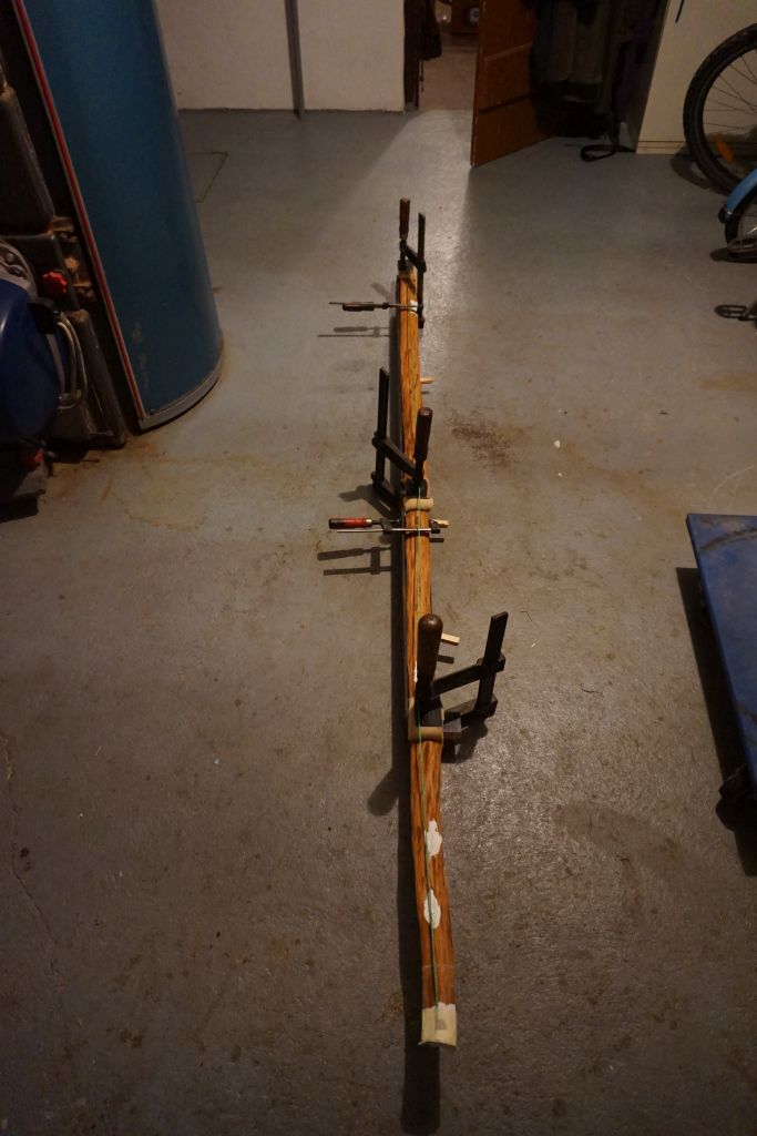. Ich habe einen ziemlich gerade gewachsenen Schwarzdorn mit wenig Ästen gefunden. Daheim mal kurz die Schnur drüber gehalten und ab ging über die Bandsäge. Danach habe ich ihn mit der Spachtel von der Rinde befreit. Nachdem ich die Mitte und den Stave über die ganze Länge 5cm breit angezeichnet habe, wurde er nochmals über die Bandsäge gejagt