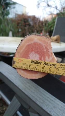 Hab vorhin ein wenig weitergemacht. Er hat zwei Astwülste, einer ist eher oberflächlich und fällt weg (im Bild unten seitlich), der andere (im Bild oben ziemlich oben) könnte interessant werden.