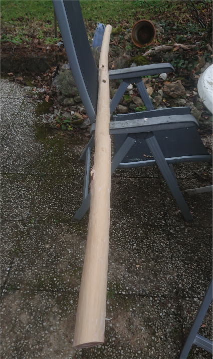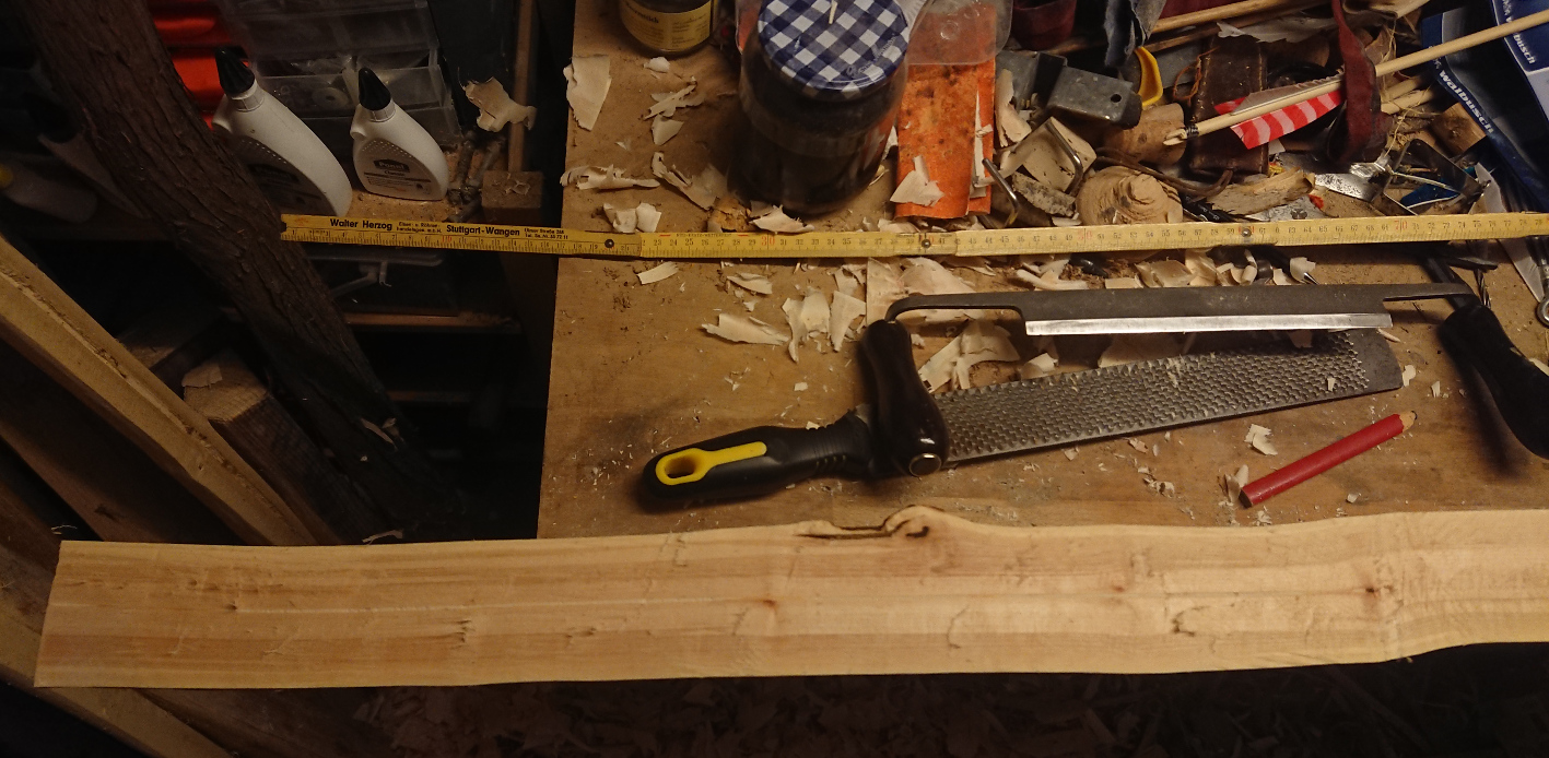 Am schmaleren Ende muss ich ein Stück absägen, im Moment ist er viel zu lang. Ziel sind höchstens 1,80m.