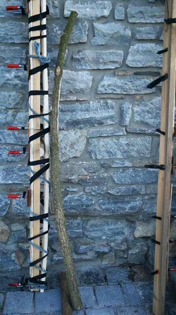 Die zweite Hälfte des Hasel hab ich gleich mal grob in Form gebracht, es soll sowas wie ein Möllegabet werden, also mit steifen Enden, die hab ich gleich etwas gebogen und danach alles wieder festgespannt, ist noch ziemlich feucht, lag ja noch draussen.