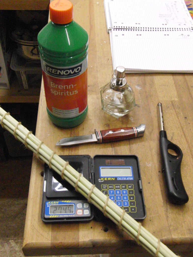 Werkzeuge, die verwendet wurden waren: Astschere, Pfeilschaftlehre (selbstgebaut), Schnitzmesser für doofe (oder für Kinder), Gewürzwaage, Spiritusbrenner, Bindeschnur.