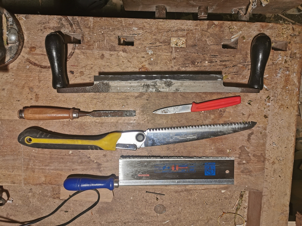 Die benutzten Werkzeuge waren: Oberfräser, Hobelmaschiene, Tischkreissäge, Japansäge, Ziehmesser