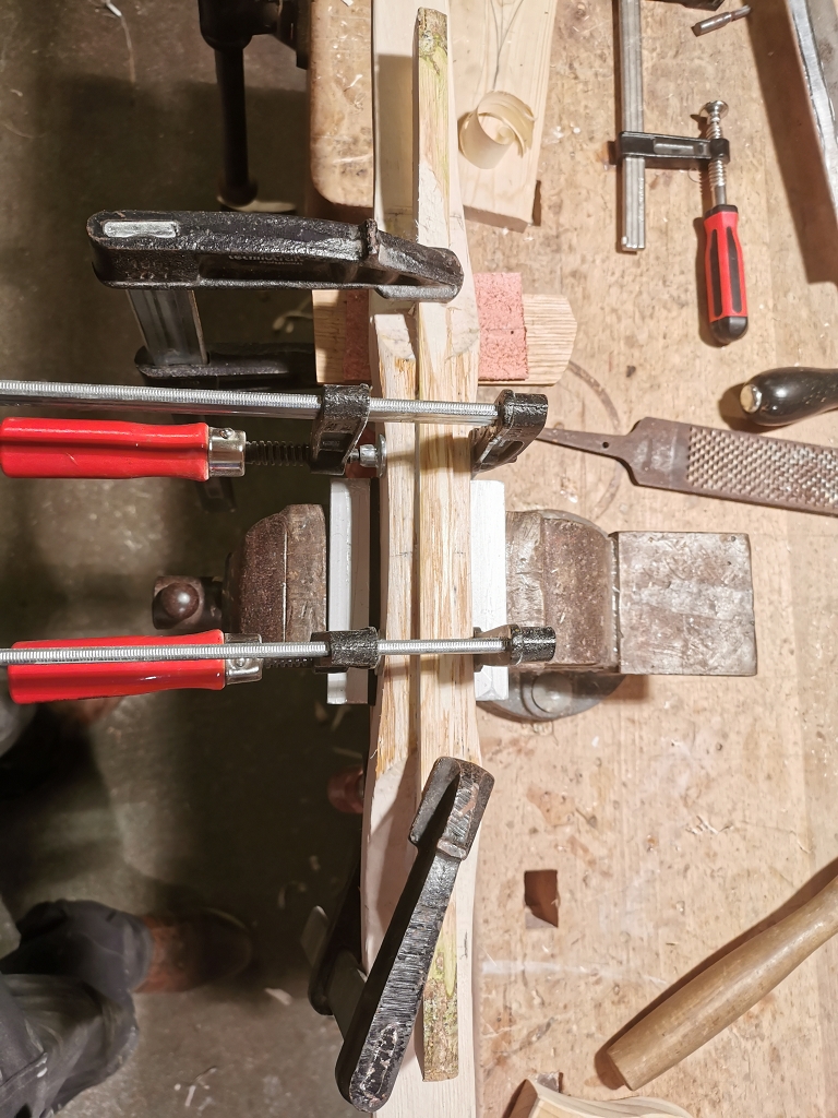 Beim Hasel ging es weiter. Ich habe ein Stück dass ich vom selben Stave abschnitt auf der Heizung getrocknet. Anschliessend zurecht gehobelt. Mit diesem Stück habe ich den Riss im Griff ausgefüllt. Zuerst habe ich mit dem Oberfräser den Riss ausgenutet und dann mit Holzleim das Stück eingeklebt.
