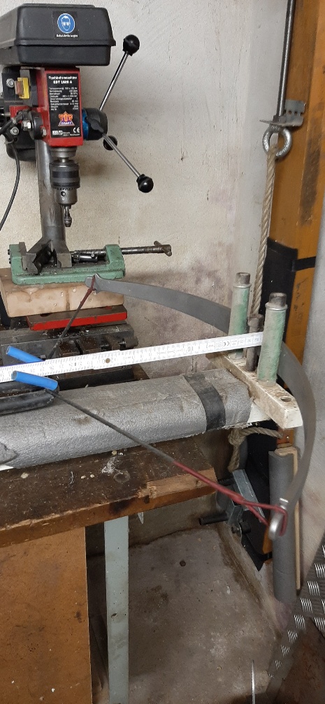 Der Bogen ist 6 5 mm dick . In der Bogenmitte ist er 40mm breit und verjüngt sich nach außen auf 20mm. Aussen ist er auch etwas dünner. Nachdem ich den Bogen fertig habe wird eine Sehne gewickelt. Dann auf der selbstgebastelten Ziehbank die Auszugslänge festlegen und mal sehen was da für eine Zugkraft entsteht.Bin mal gespannt!