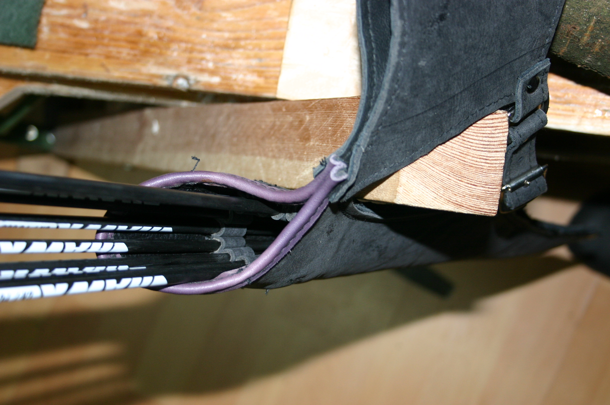Den oberen Rand hab ich eingefasst, damit die beiden Lederstücke durch das einstecken der Pfeile nicht aus Versehen auseinder gehen können. Der Köcher fasst bequem 12 Carbon Pfeile. Bei Holz schäften passen max. 10 Stück in den Köcher.