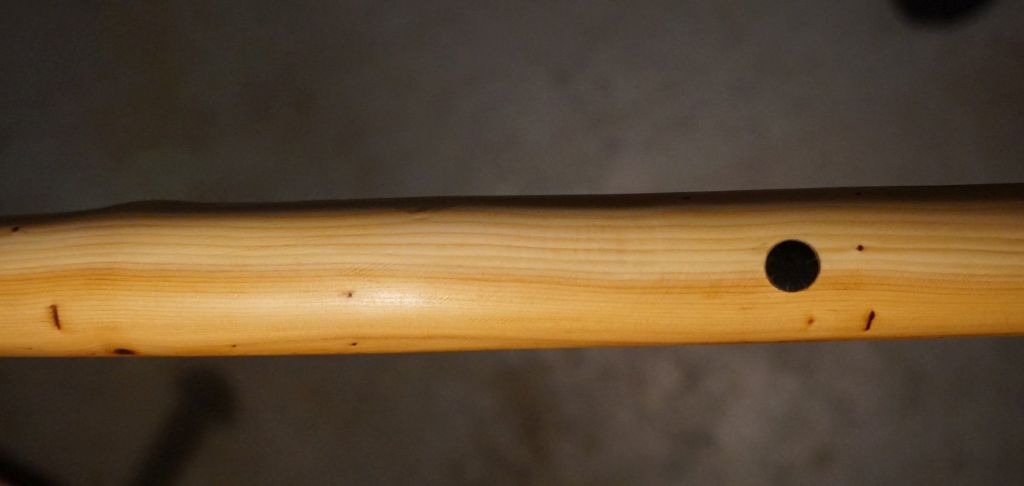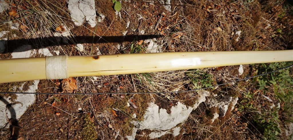 Nur der Rücken war im oberen Wurfarm mit Längsrissen durchzogen, die durch das Dämpfen noch mehr heraus gekommen sind. Man sieht dem Stave einfach die Spannungen an, die in dem Ast drin steckten und sich beim herausarbeiten entladen haben. Leider haben sich am Bauch beim Deflex herausbiegen am Bauch eine Faser aufgestellt. Nichts dramatisches, nur nach dem Einschießen hat er sich wieder aufgestellt , sodass ich ihm eine Wicklung aus Flachs verpasst habe und jetzt ist Ruhe