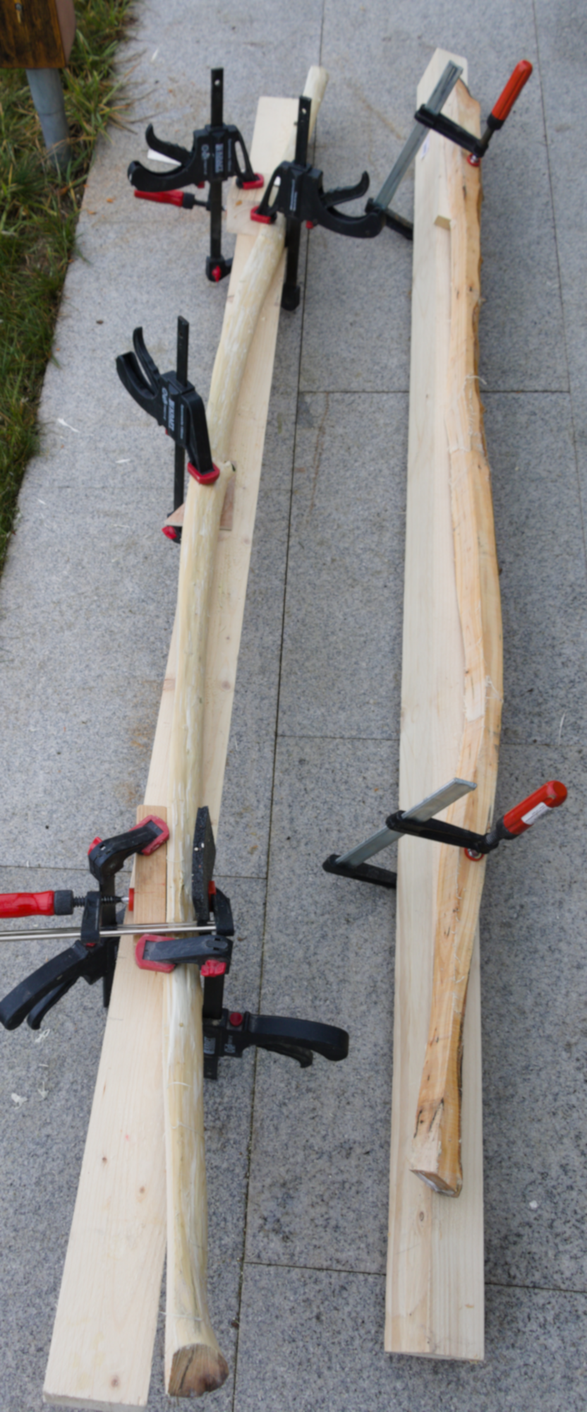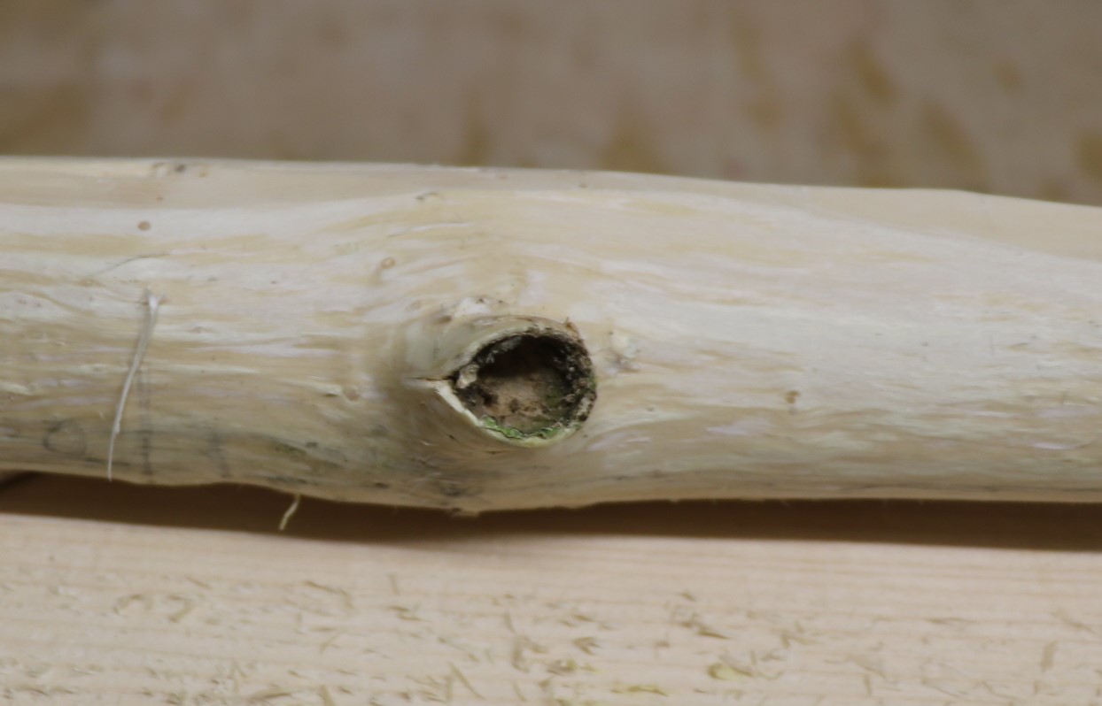Alle Äste und die Enden habe ich mit Holzleim versiegelt und den Stave wieder auf den Balken gespannt.
