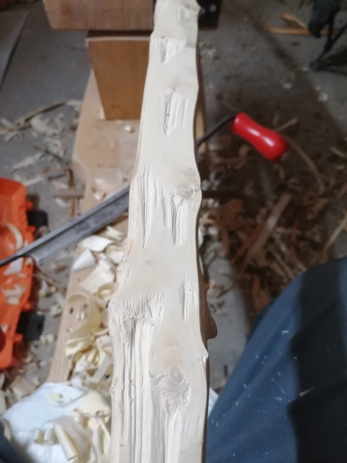 Vieele Äste machten das Ziehmesser bald obsolet. Da half nur Raspeln. Und dann waren da noch diverse Knicke. Insgesamt wurde sie 8 mal gedämpft.