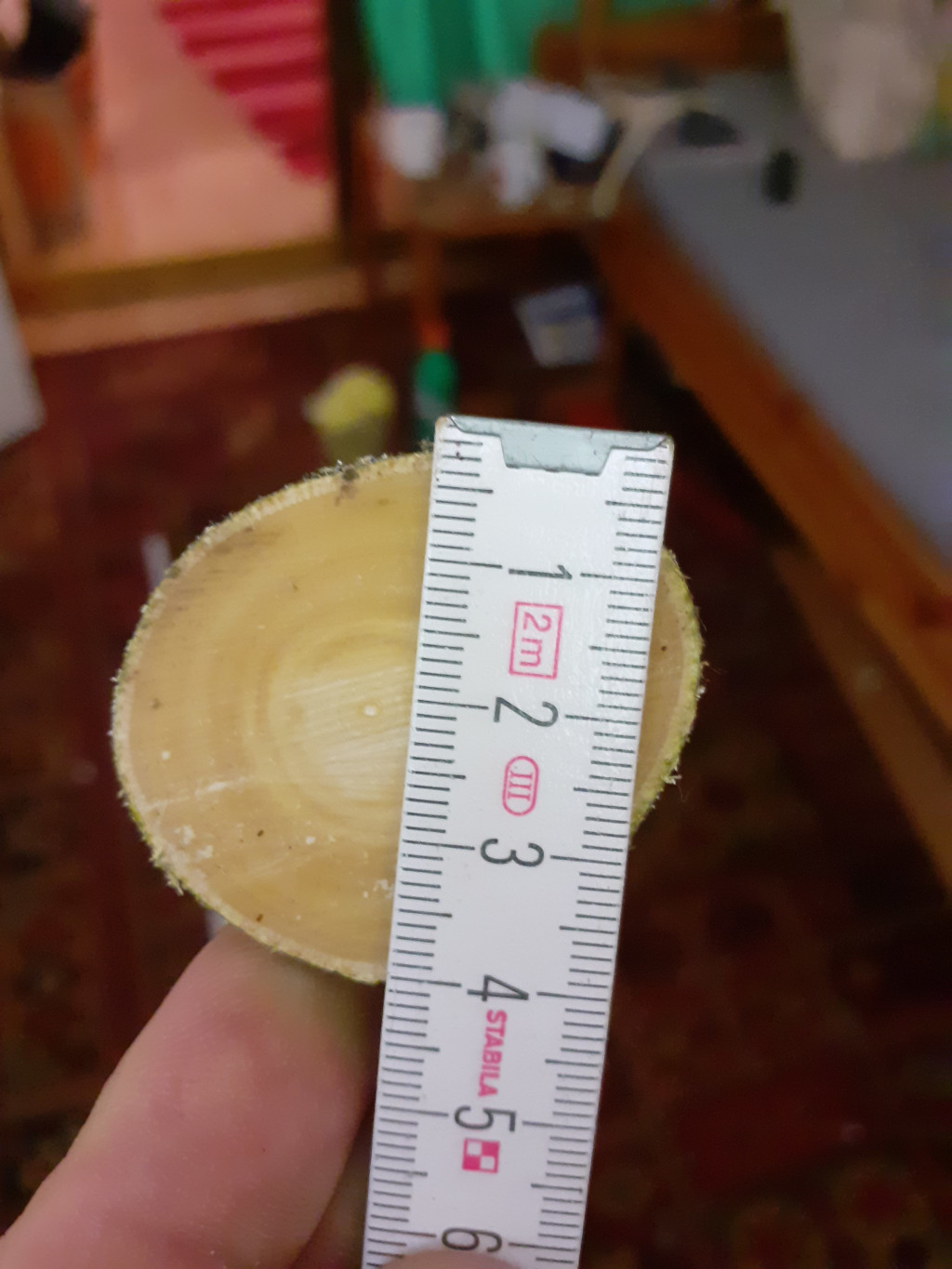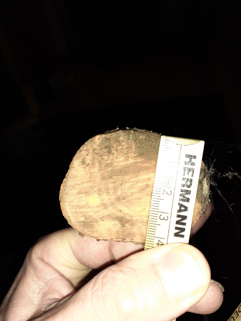 Was Anderes: woher die 4,5cm mittlere Dicke kommen. Auf einem Bild sieht man ganz gut,das er breiter als hoch ist. Die etwa 6cm Breite am unteren Ende ist seitlich,also kann ich nur den flacheren Teil nutzen.Hartriegel nehm ich normalerweise lieber hochkant,wenn er einen elliptischen Querschnitt hat,das ist hier nicht möglich.... egal,er ist ja knapp dick genug.