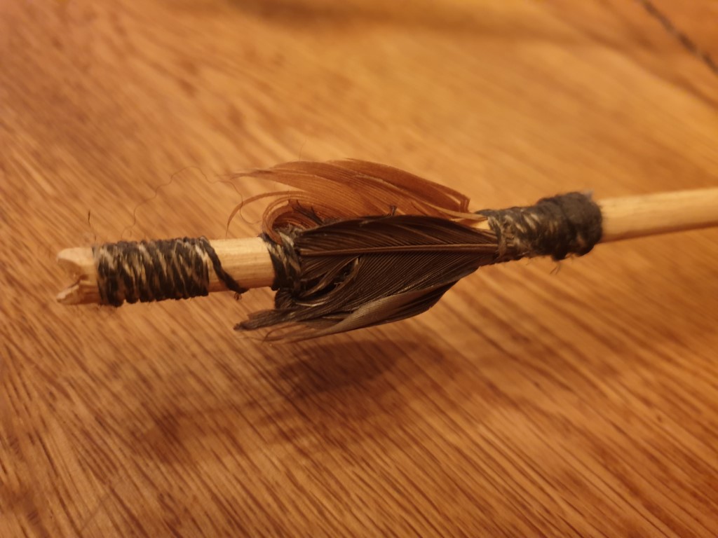 Womit sie umwickelt sind, weiß ich nicht, ebenso wenig was für Holz für die Schäfte verwendet wurde. Sie wiegen zwischen 15 und 20 Gramm. Die Befiederung besteht aus kleinen, komplett, aber teilweise flaumig wirkenden Federn, die nur mit der Kielspitze per Wicklung am Schaft befestigt sind. Vor der eher nur angedeuteten Selfnocke gibt es eine weitere kurze Wicklung.