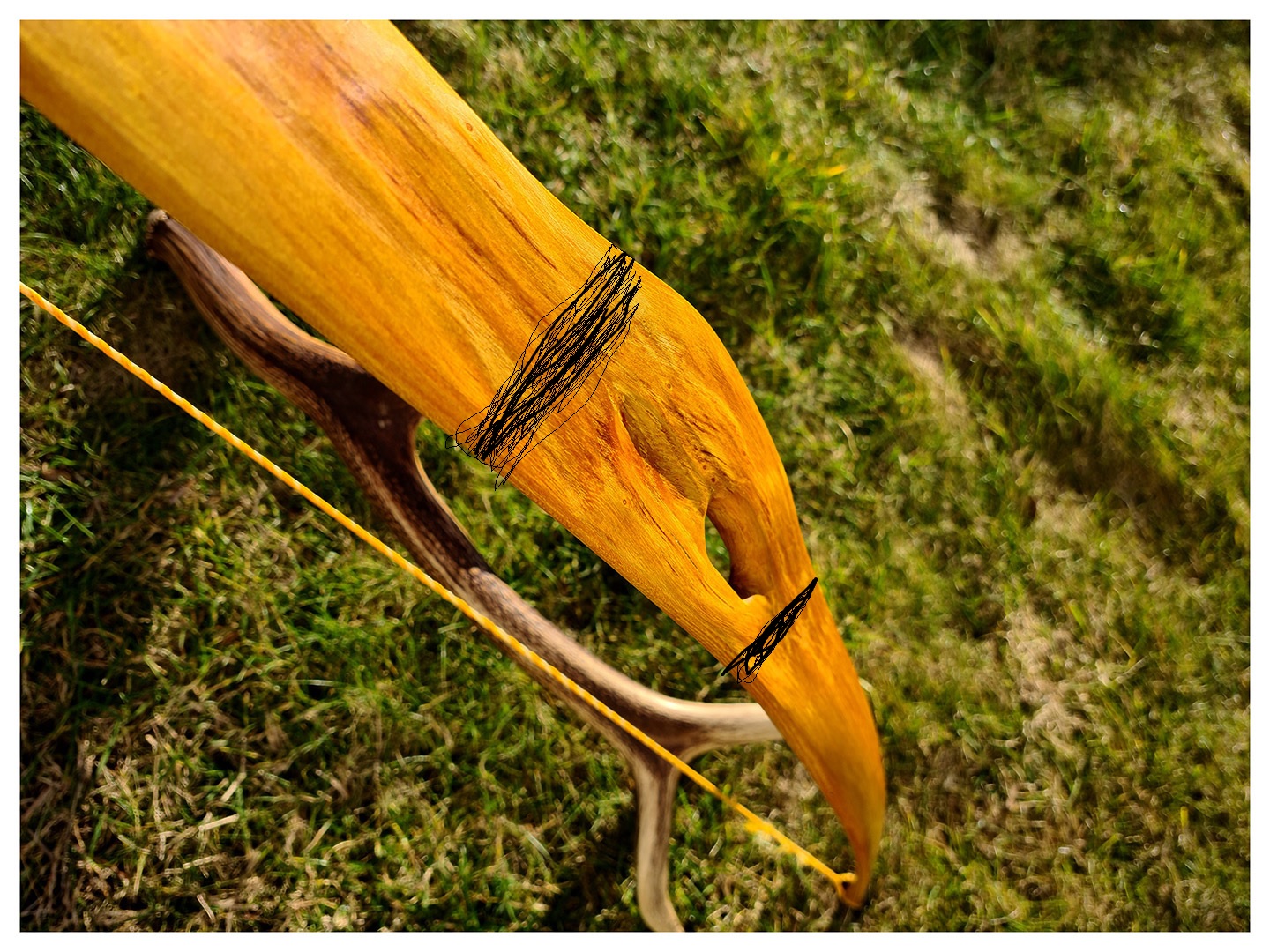 Als Wicklungsmaterial würde ich bei diesem Bogen Sehne verwenden oder I(wg. dem Kontrast) schwarzen Leinenzwirn.