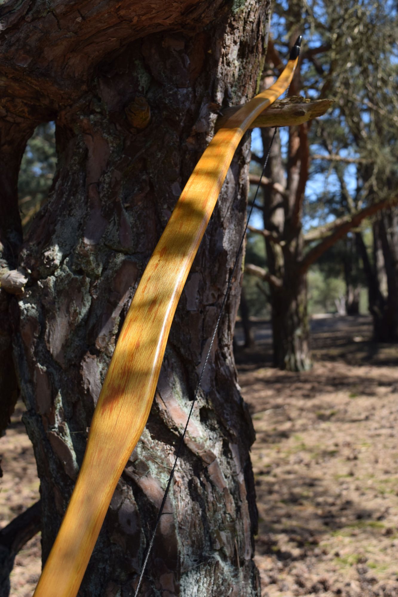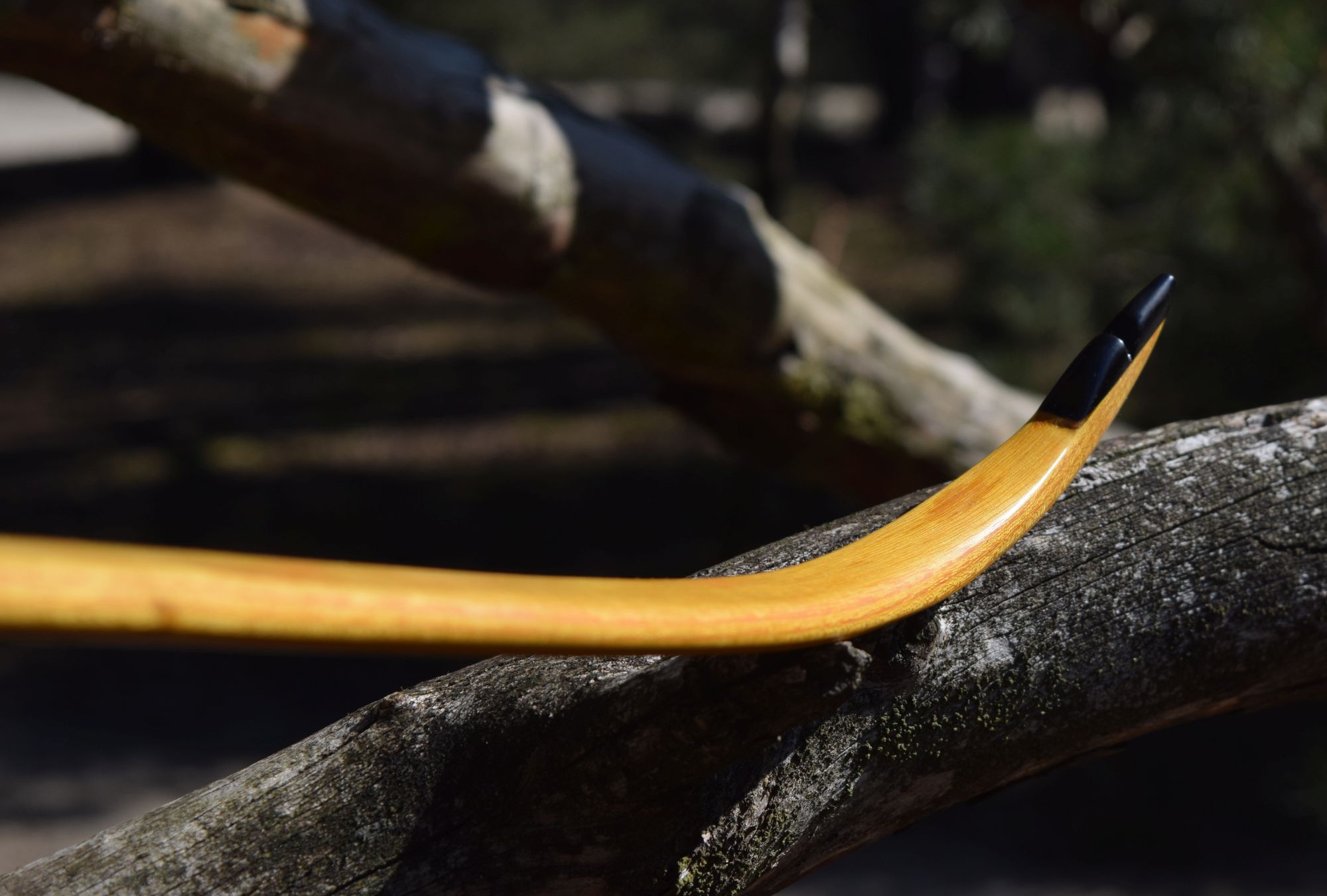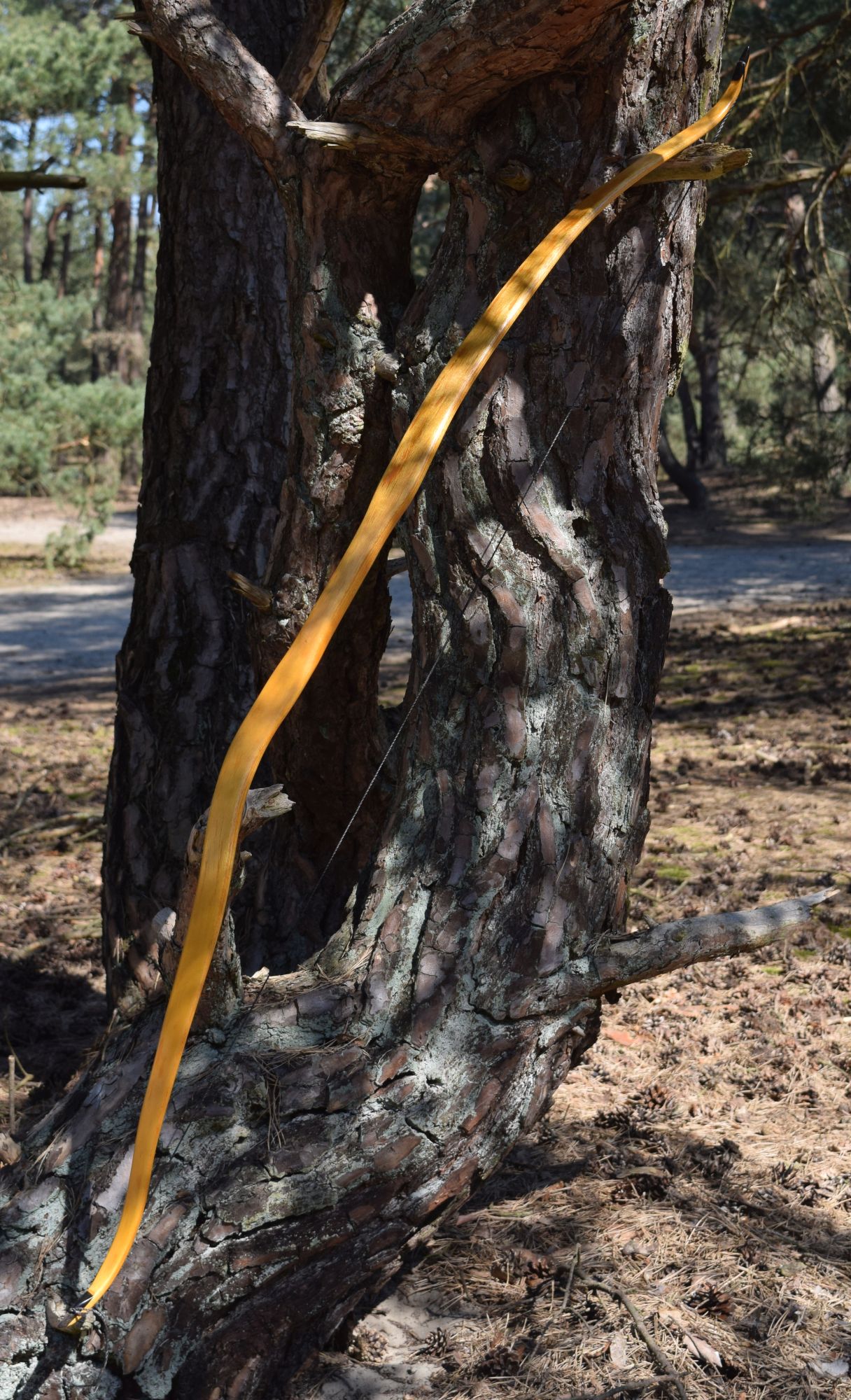 Hier auch mal wieder was von mir zum Zeigen. Der Bogen ist aus einem dünnen Reststück vom Spalten meiner Osage-Rohlinge. Viel Fleisch war nicht, der Griff ist deshalb sehr dünn, hat sogar noch Ausreisser vom Spalten. Optisch ein wenig schade, weil ich andere Griffformen bevorzuge und auch die Fade-outs schöner auslaufen lassen würde, aber funktional erfüllt er seinen Zweck. Ich musste den Rohling einmal im Sehnenverlauf (Sehne lief gut 5cm seitlich vom Griff) korrigieren und die Schräglage eines Wurfarms korrigieren – alles mit Wasserdampf, weil der Bogen einige Risse aufweist, die ich mit langer trockener Hitze nicht noch weiter vergrößern wollte. Eigentlich hätte ich den aktuell unteren WA lieber als oberen WA gehabt, wollte aber nicht weiter dämpfen. An einer Stelle habe ich die Risse erst nach dem Finish entdeckt, evtl. muss ich da nochmal ran. Die Bilder vom Tiller sind nicht so dolle, da aus einem Video herausgeschnitten – den Tiller sollte man aber erkennen.