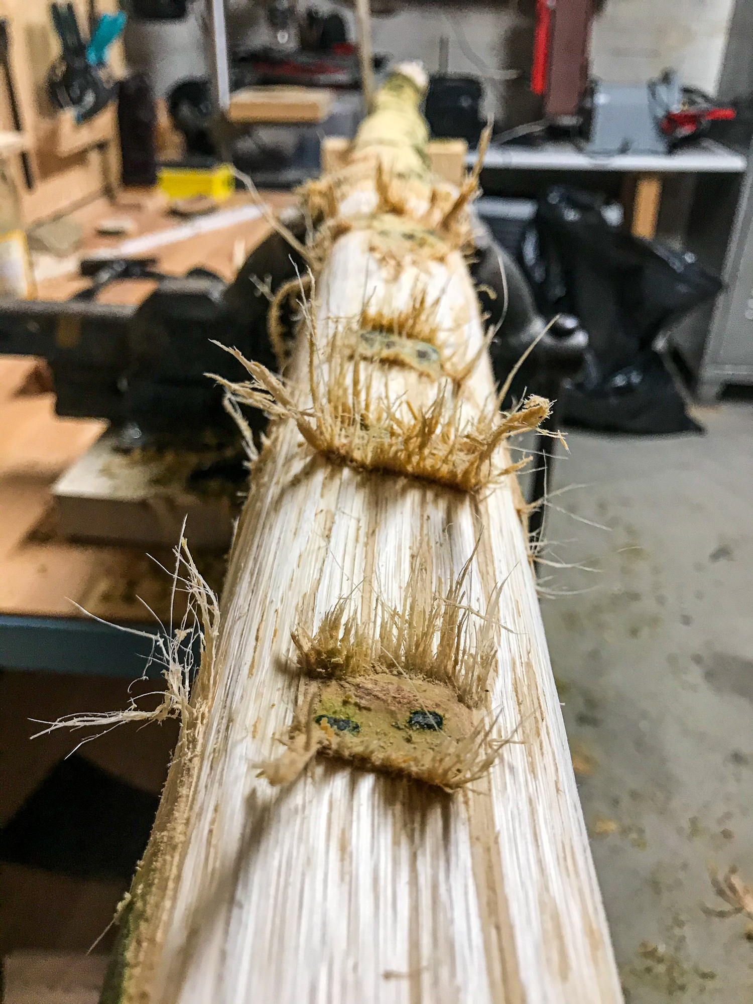 Der Rücken ist stellenweise zerfurcht, mit einigen tieferen Furchen in die die Rohaut sich nicht wird reinquetschen lassen. Leider schwer zu fotografieren. Das würde mit Hanf- oder Leinen-Fasern besser gehen, aber erzeugt das dann nicht stärkere Bereiche, die den Bauch überlasten könnten? Deswegen könnte ich mir vorstellen den oberen Ring runterzunehmen und damit die Furchen auszugleichen. Oder kann ich den Rücken unter der Rohhaut einfach "planieren" und die hält mir den Bogen genug zusammen?