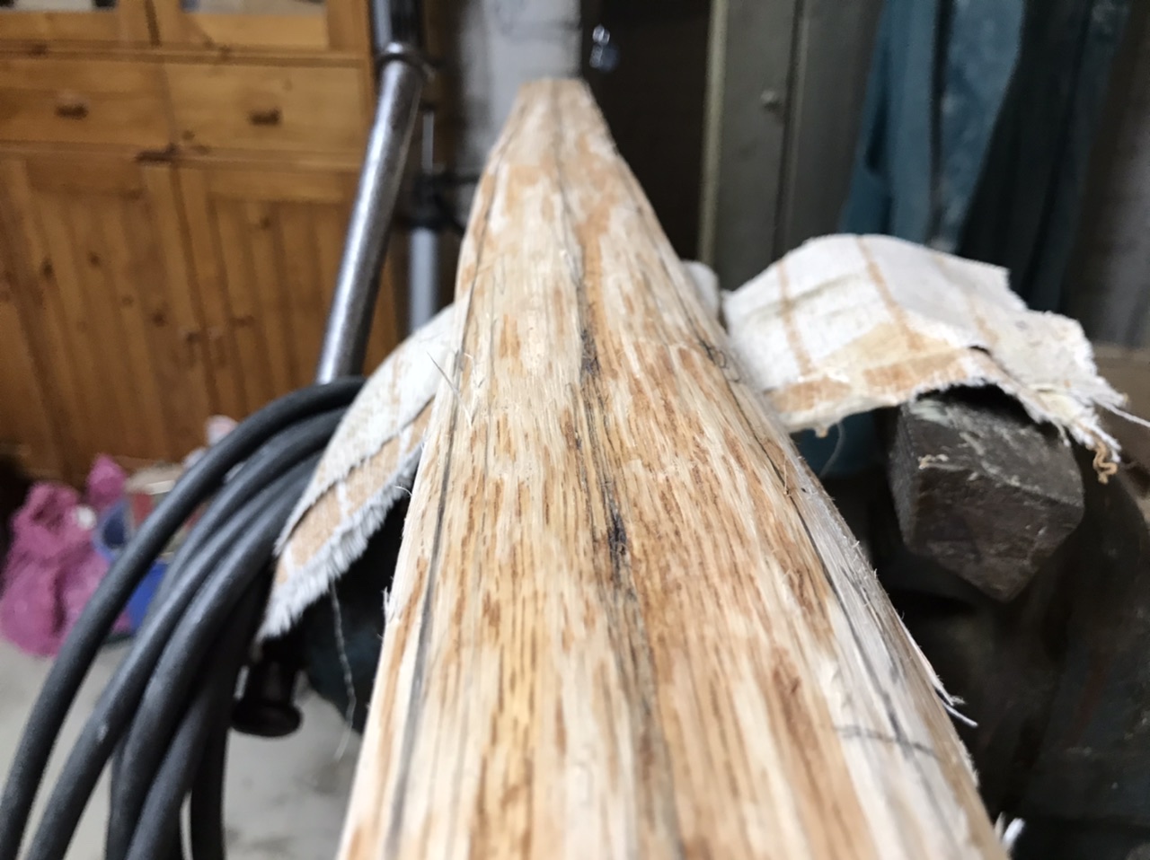 Die Roteiche hatte noch eine Überraschung... Im Anschnitt habe ich das nicht kommen sehen, so aber zog sich diese Gammelstelle fast bis zum Griff hoch, mal mehr mal weniger groß. Das Holz darunter fühlt sich stabil und unverändert an, hoffentlich gilt das auch für die Druckbelastbarkeit.