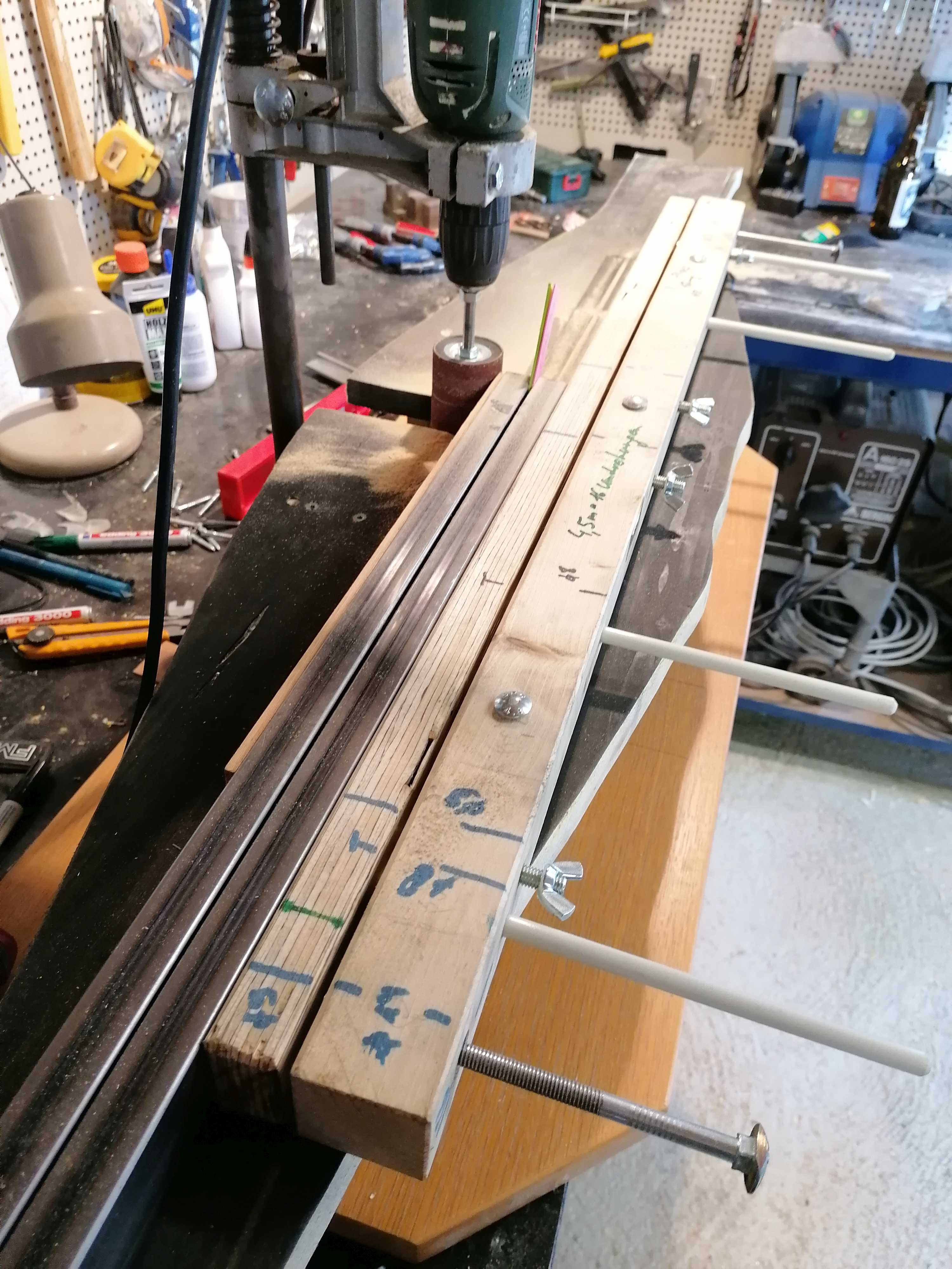 Dann wird auf der inneren Metallleiste die Holzleiste montiert. Das geht relativ einfach mittels Schraubzwinge ganz außen. Das Paket Metallrohre mit aufgeschraubter Holzleiste wird jetzt gegen den Lauf der Schleifspindel vorbeigeschoben.