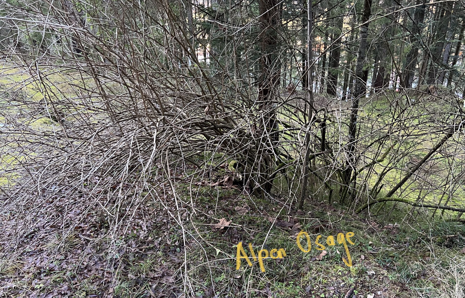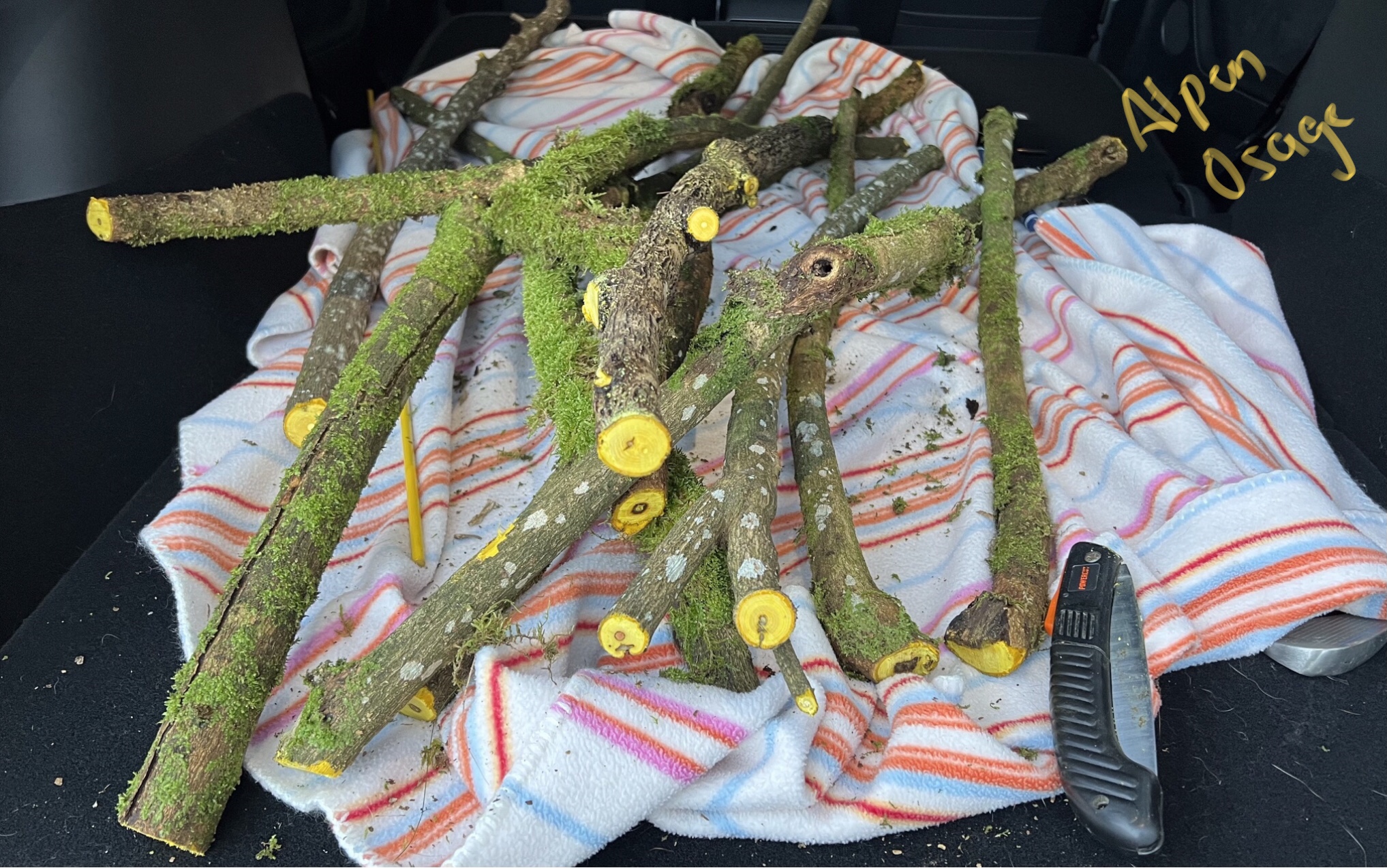 Meine erbeuteten Hölzer habe ich vorab bei Spaziergängen in einem Umkreis von 3km von zuhause ausgespäht und heute geerntet. Der schneearme Winter hat es möglich gemacht, dass ich auch Alpen Osage ernten konnte, da dieser strauchartig wächst und sonst immer eingeschneit ist. Es ist viel “Reißholz” dabei. Die nächsten Wochen werden zeigen, was davon übrig bleibt und in die Präsentation will. Aus diesem Grund sind auch 2 Reservehölzer (Hasel und Holunder) dabei. Ich wünsche allen gutes Gelingen.