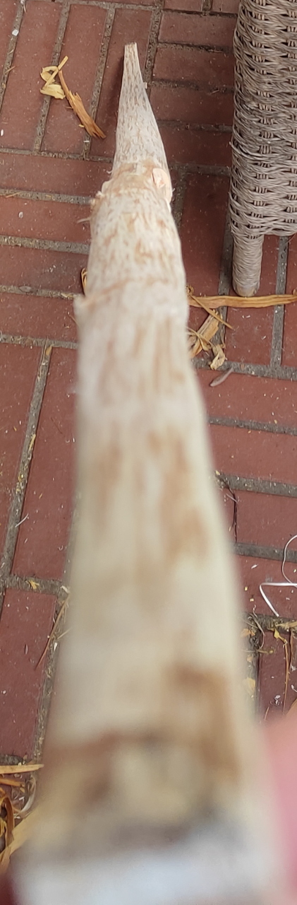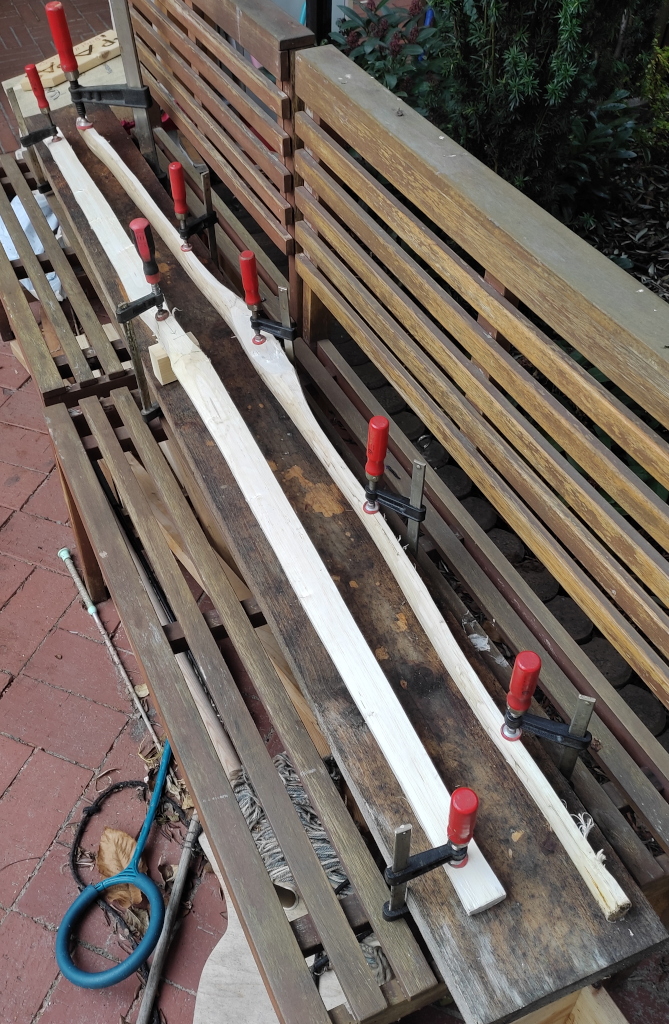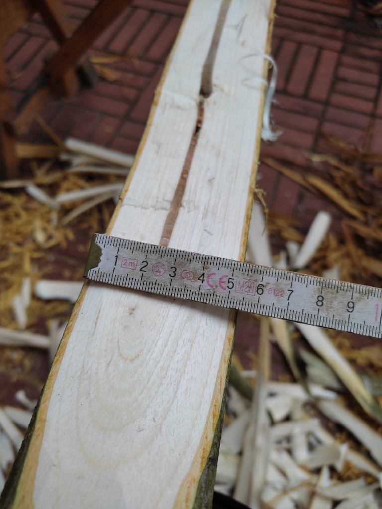 Erstmal 23cm abschneiden, da war so ein doofer Knick: Dann über Rücken gepeilt, schön gerade: Dann runtergearbeitet Hat ziemlich Reflex Dicke und Breite noch weit über Endmaß: Trocknet jetzt erstmal so, nicht eingespannt. Mal gucken was daraus später wird.
