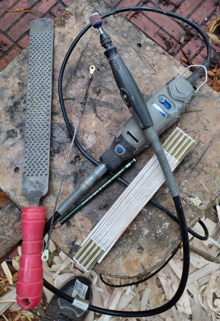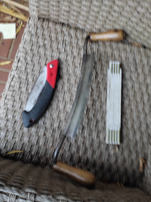 Hier die Bilder der bisher verwendeten Werkzeuge, unspektakulär. Klappsäge, Meterstab, Ziehmesser, Bleistift, Spachtel, Axt. Ein Foto sehr verwackelt, aber man erkennt es.