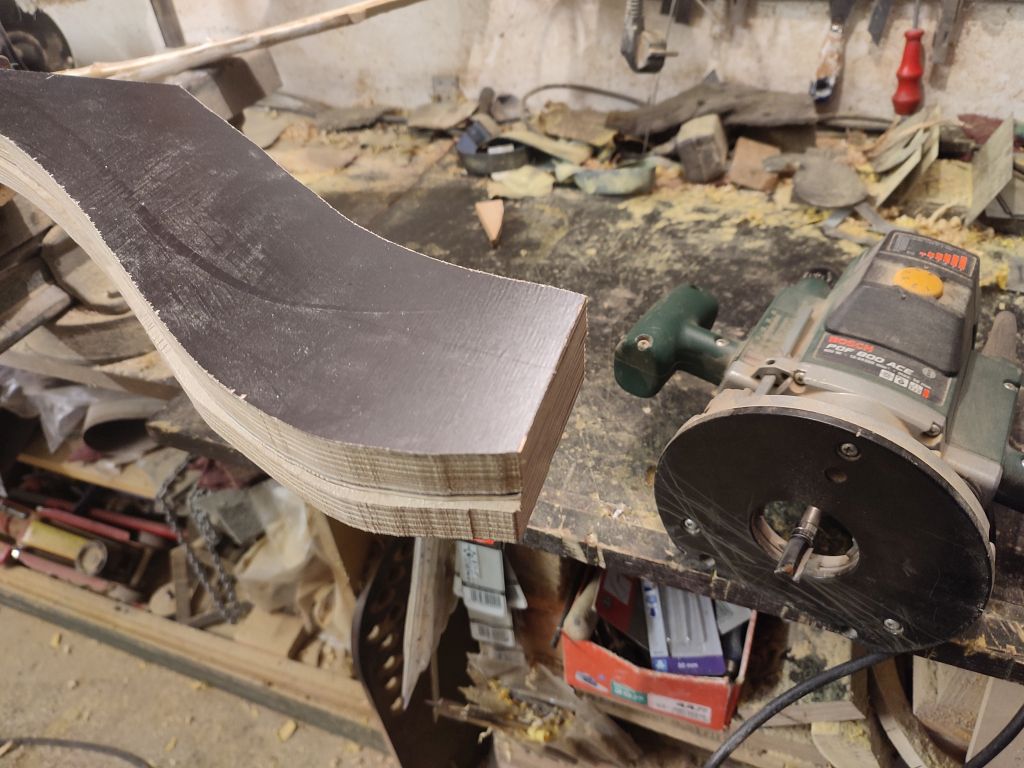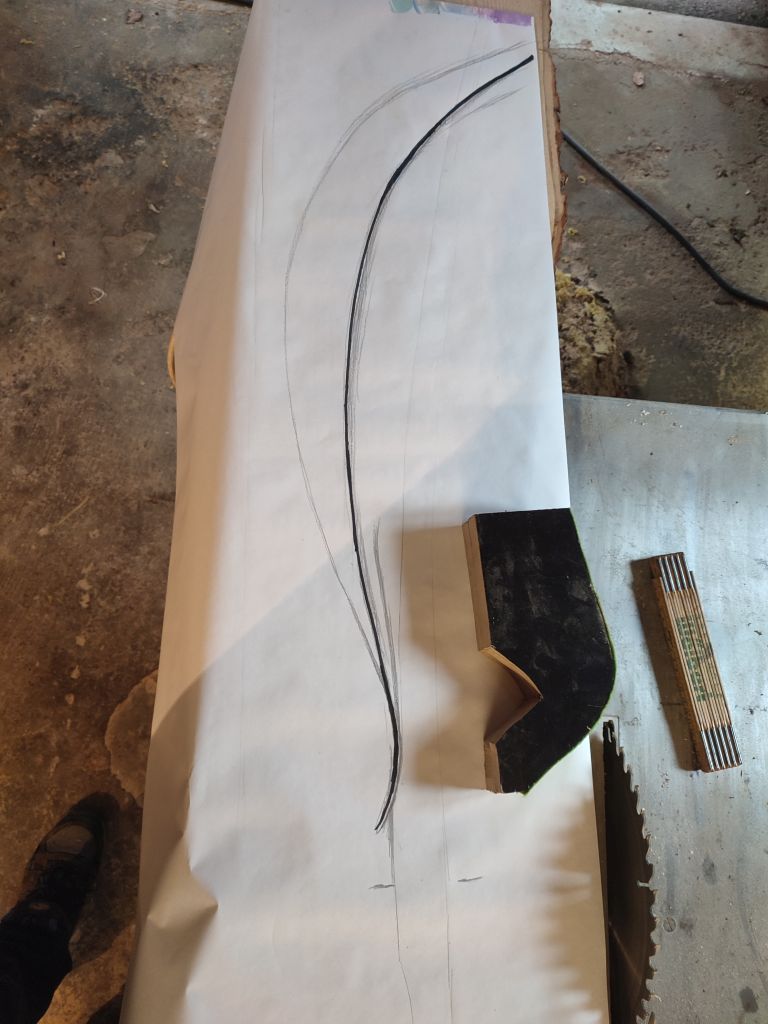 Da die Zeit ja recht begrenzt ist und ich nicht weiß, wie das mit dem Griff werden soll, habe ich versucht die Form des Innenbogens festzulegen. Danach wurde die Form erstellt und Teile der Hölzer des innen Bogens in die Form gebogen. Er ist jetzt etwas stärker gebogen, als er nachher sein wird, da er wieder etwas zurück kriechen und auch beim Tillern die Form etwas verlieren wird. Mal sehen ob das alles nachher zusammen passt ;D