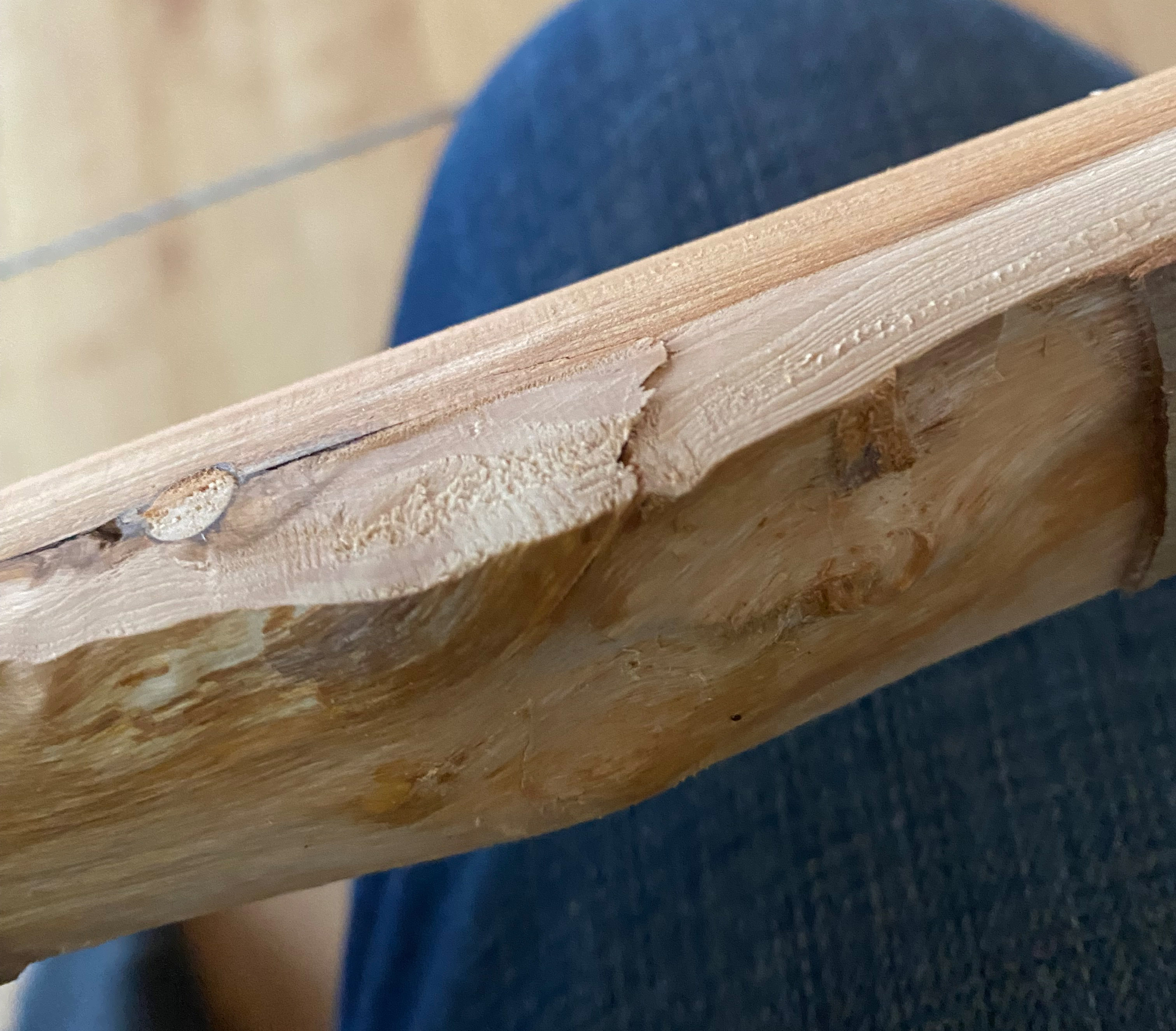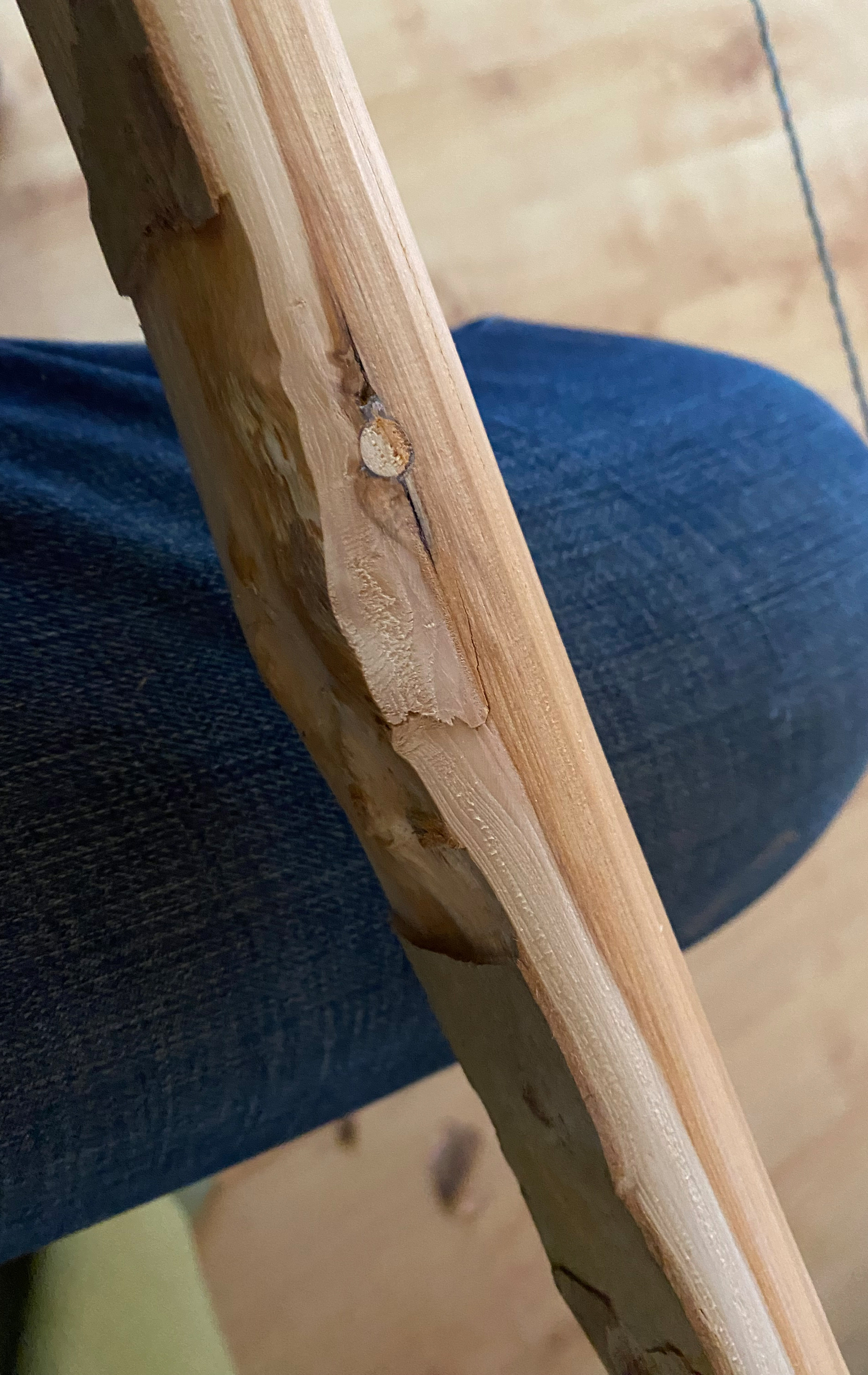 Meine nächste Eibe macht mir Kopfzerbrechen. Nämlich gibt es eine ziemlich dämliche Störung im Holz. Tom hat auf eine verwachsene Verletzung von früher getippt, und das scheint mir schlüssig. Ich habe versucht, mit einem Holzdübel gegenzusteuern und den Bogen heute erstmals auf Standhöhe gebracht.