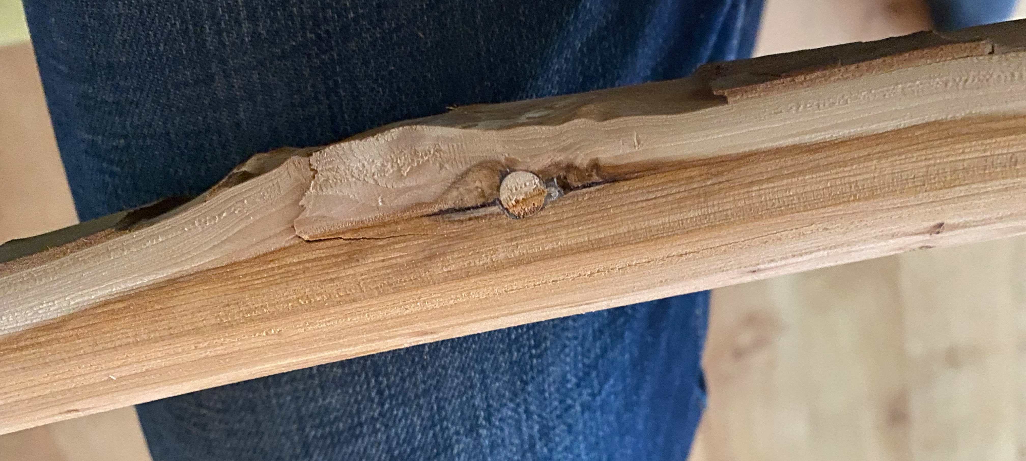Der Riss ist entstanden, weil da sie Fasern schief laufen, der Riss folgt der Faser.