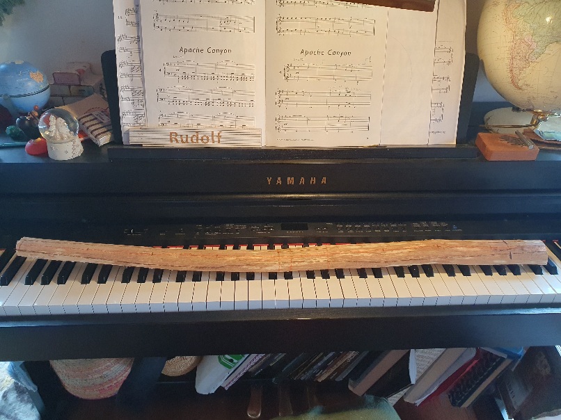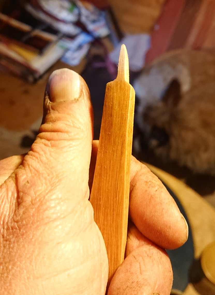 Dachte daher an ein "Paddel"/ "Indianerbogen" oder wie man es nennen mag. Hasel war noch da, sogar gespalten und trocken. So ein Design haben wir noch nicht probiert, daher juckt es mich