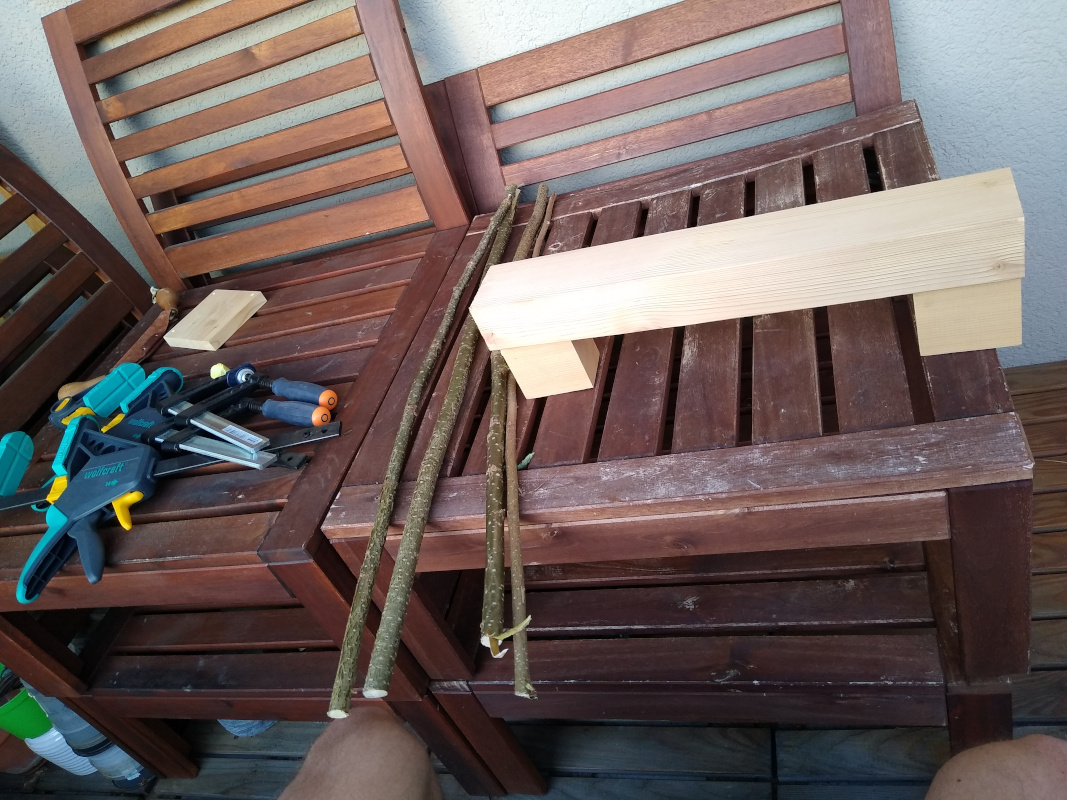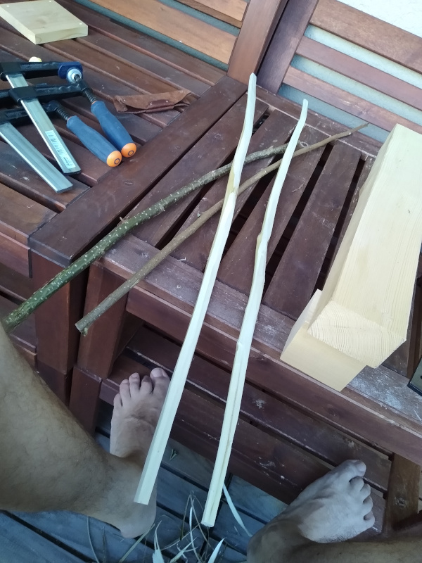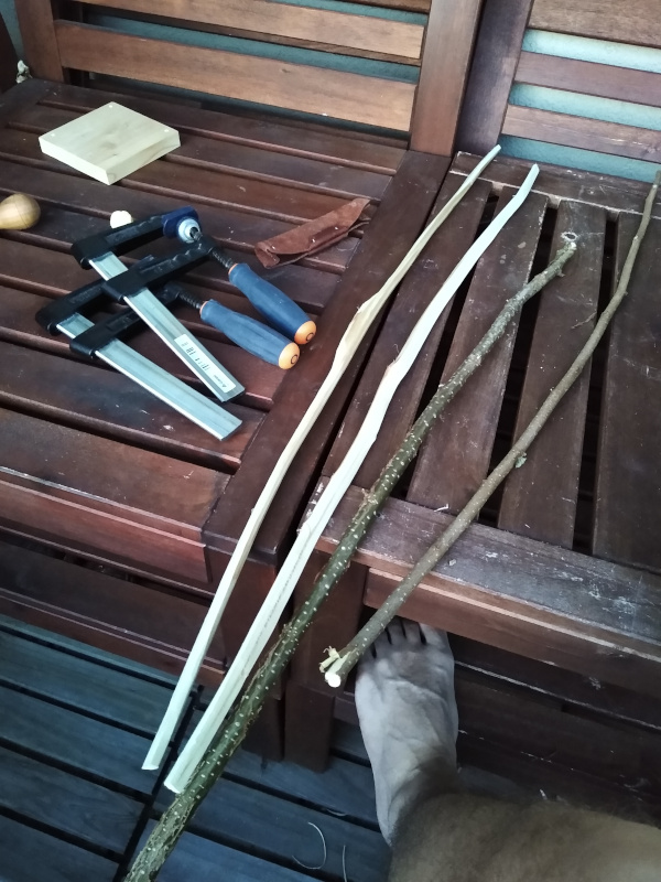 die Zeit vergeht … und so geschieht es, dass Sohn mich plötzlich fragt, ob ich ihm einen Bogen baue. Und ich bin wirklich unschuldig: das hat er nicht bei mir gesehen! Meine Bögen liegen aus verschiedenen Gründen seit Jahren untätig herum.